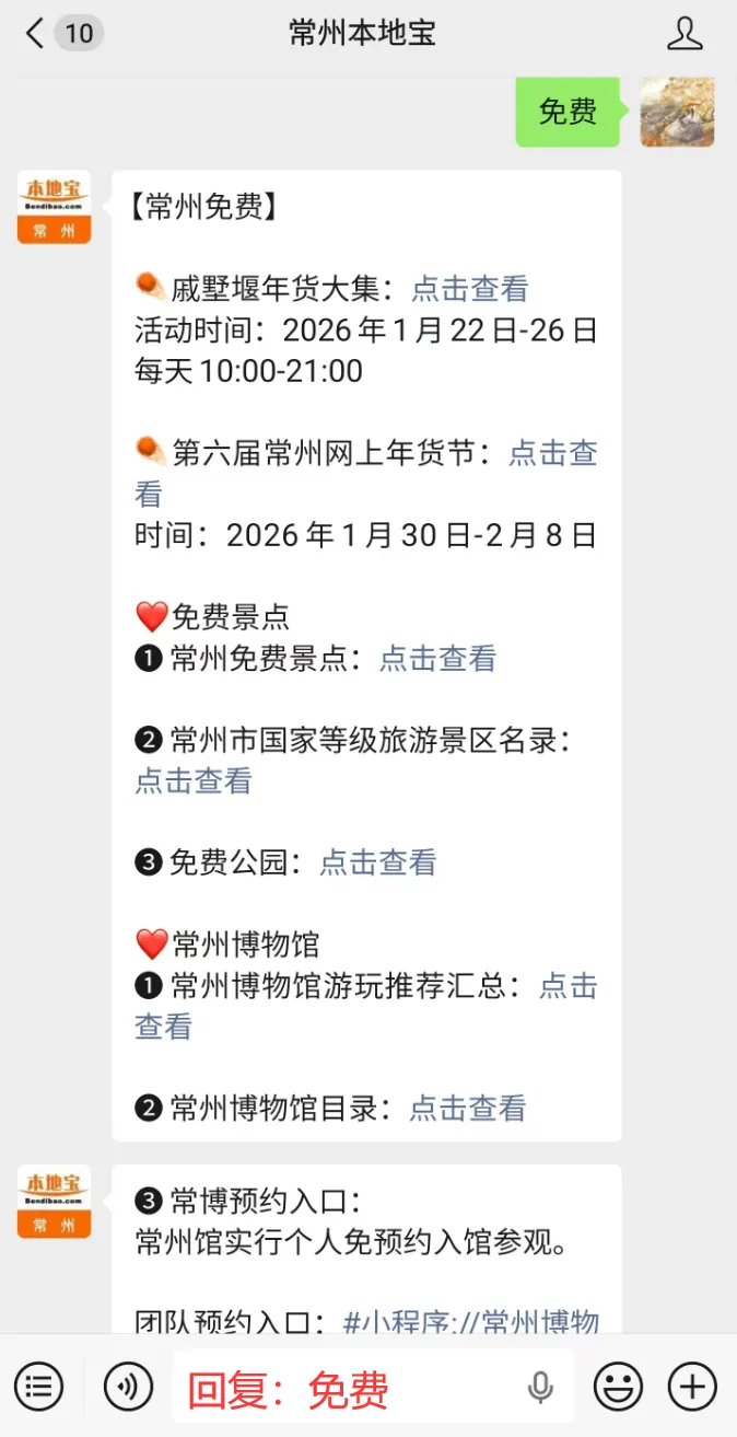 点击识别下方二维码,关注【常州本地宝】,点击发消息,在聊天对话框发送“免费”,即可获取2026常州免费活动(持续更新)、常州免费景点、免费公园、常州市国家等级旅游景区名录等信息。