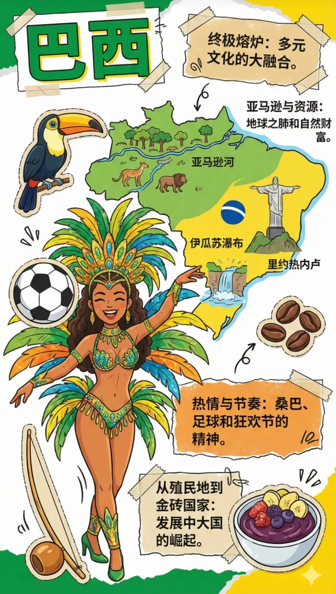 2. 购物指南• 圣保罗:伊比拉普埃拉购物中心,涵盖国际品牌和巴西本土设计师品牌• 里约热内卢:科帕卡巴纳海滩周边的手工艺品市场,购买桑巴鼓、彩色手链等特色纪念品• 特产推荐:巴西咖啡(蓝山咖啡的优质替代品)、蜂胶(药用价值高)、宝石(紫水晶、黄玉价格实惠)• 消费提示:大多数餐厅加收10%服务费,服务满意可额外给5%-10%小费;购物可退税,保留收据在机场办理四、安全与实用贴士1. 安全防护• 财物安全:避免展示贵重物品,用贴身腰包存放护照和现金;在海滩游玩时,不随意离开行李• 紧急情况:巴西报警电话190,急救电话192;提前保存中国驻巴西大使馆联系方式,丢失护照立即报案并联系使馆• 区域禁忌:里约、圣保罗的贫民窟除非有专业导游陪同,否则严禁进入;边境高危区尽量避开2. 文化与通讯• 语言:巴西官方语言为葡萄牙语,旅游区英语普及率较低,提前下载谷歌翻译(支持离线翻译),学习基础用语(Olá=你好,Obrigado/obrigada=谢谢)• 礼仪:巴西人热情友好,社交场合不插嘴,不打听工资、年龄、婚姻状况等隐私;排队不插队,禁烟区不吸烟• 通讯:购买当地电话卡(Vivo、Claro信号较好),提前开通流量套餐;部分偏远地区(如亚马逊雨林深处)无信号,出发前告知亲友行程!