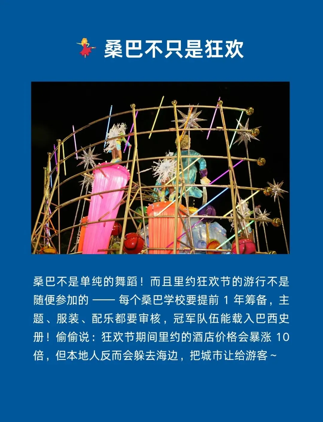 • 里约热内卢(6天):热情与山海的交响◦ 必游景点:基督山(登顶俯瞰全城,与张开双臂的耶稣像合影)、科帕卡巴纳海滩(世界最性感海滩,晨起看日出,午后体验沙滩排球)、糖面包山(乘坐缆车欣赏海湾全景)、里约大教堂(造型奇特如伞形,内部光影震撼)◦ 特色体验:参加桑巴夜校课程,跟着当地人学跳热辣桑巴;若恰逢2月中旬至下旬,亲历“地球上最伟大的表演”——里约狂欢节,提前3个月预订门票和住宿◦ 安全提示:避免前往非旅游区贫民窟,夜间不单独出行,海滩活动避开深夜时段