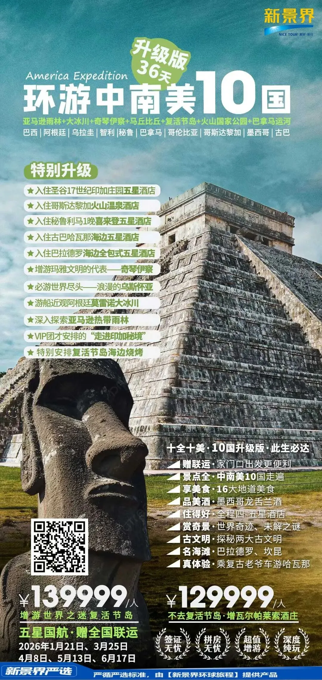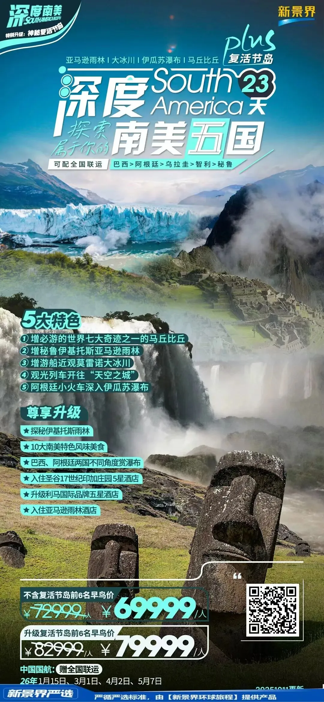 ✅巴西+阿根廷(增大冰川)+乌拉圭+智利(可增游复活节岛)+秘鲁(增亚马逊雨林)
