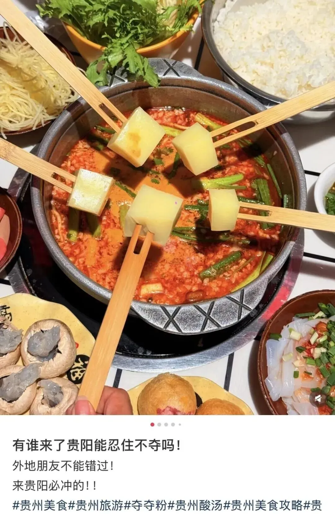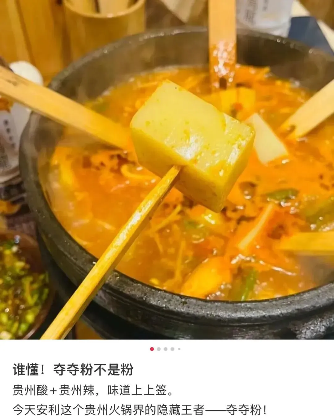 安顺版的迷你火锅,小火炉上架个小砂锅,汤底有酸汤、麻辣、酸辣可选。主角是米粉片,还有几十种配菜,大家围着小锅用竹签戳起食物涮着吃。最精彩的是最后环节:点一碗白米饭倒进吸收了所有食材精华的汤里煮成粥。