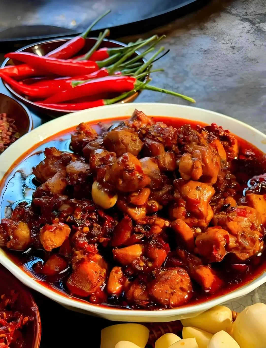 选用本地土鸡,肉质紧实,辣椒用安顺特产鸡爪椒,辣味醇厚不燥。最特别的是烹饪方法:先用多种香料炒制,再加入安顺特产甜酒酿焖烧,让辣味中带着一丝回甘。