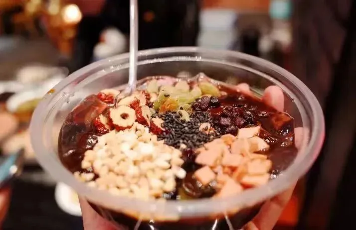 在安顺,任何辣味小吃的官方CP都是冰浆。新鲜水果、冰块、糯米一起打碎,打成细腻的冰浆,上面撒上花生碎、葡萄干。口感层次丰富:冰爽、果香、糯米的Q弹、花生的香脆,全部在一杯里。