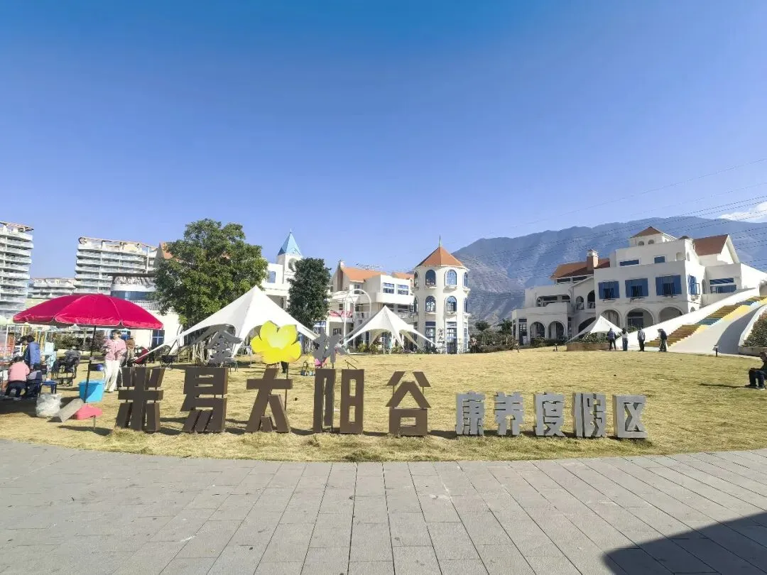 这里的全称是金杯半山・米易太阳谷康养旅游度假区,坐落于攀枝花市米易县新山傈僳族乡,背靠巍峨龙肘山,凭栏可俯瞰米易县城全貌,与新山傈僳梯田咫尺相邻;距米易县城仅约15分钟车程,总投资约160 亿元,由金杯半山集团倾力打造,是四川省重点康养示范项目,融田园综合体与特色小镇于一体。
