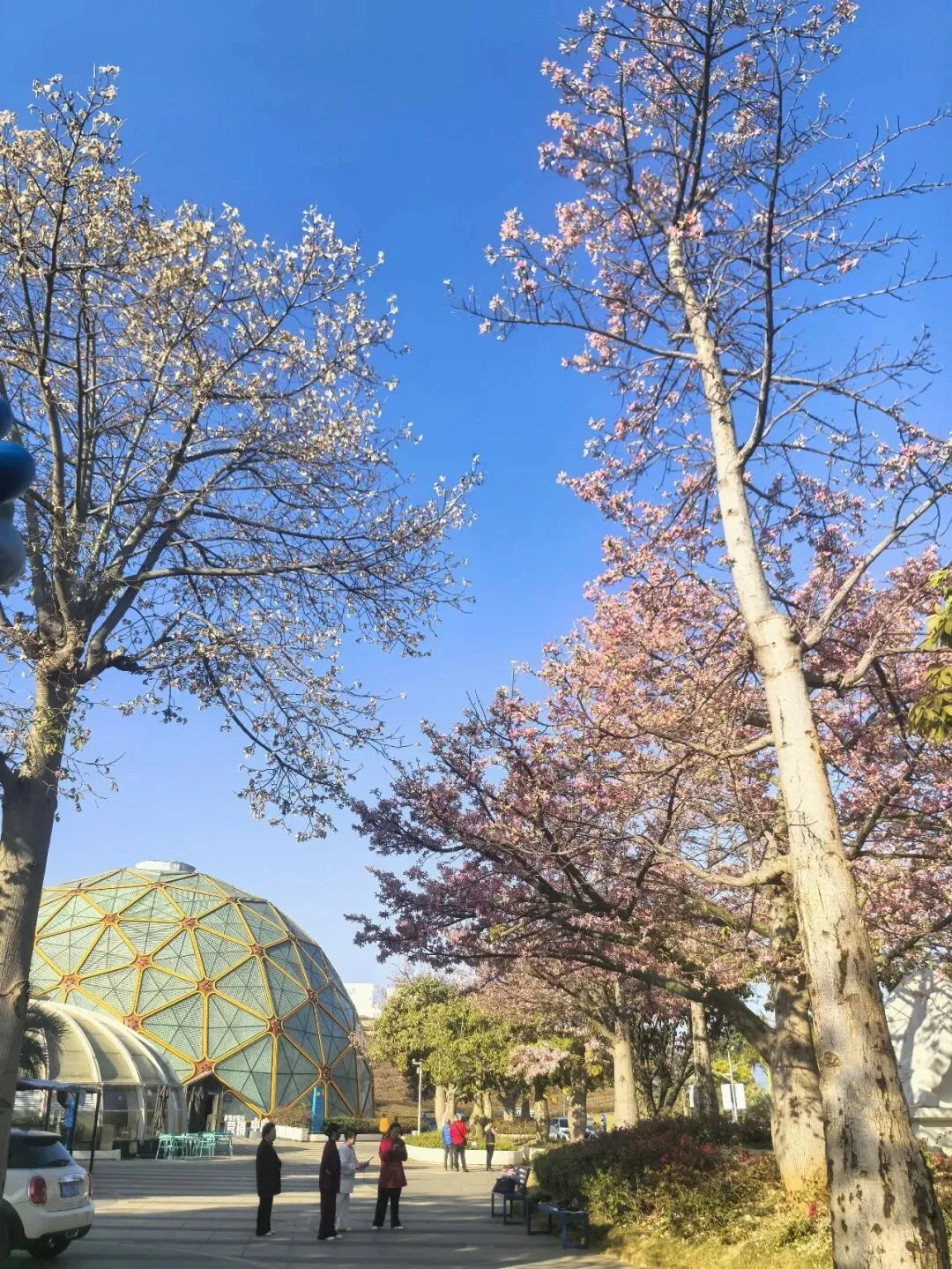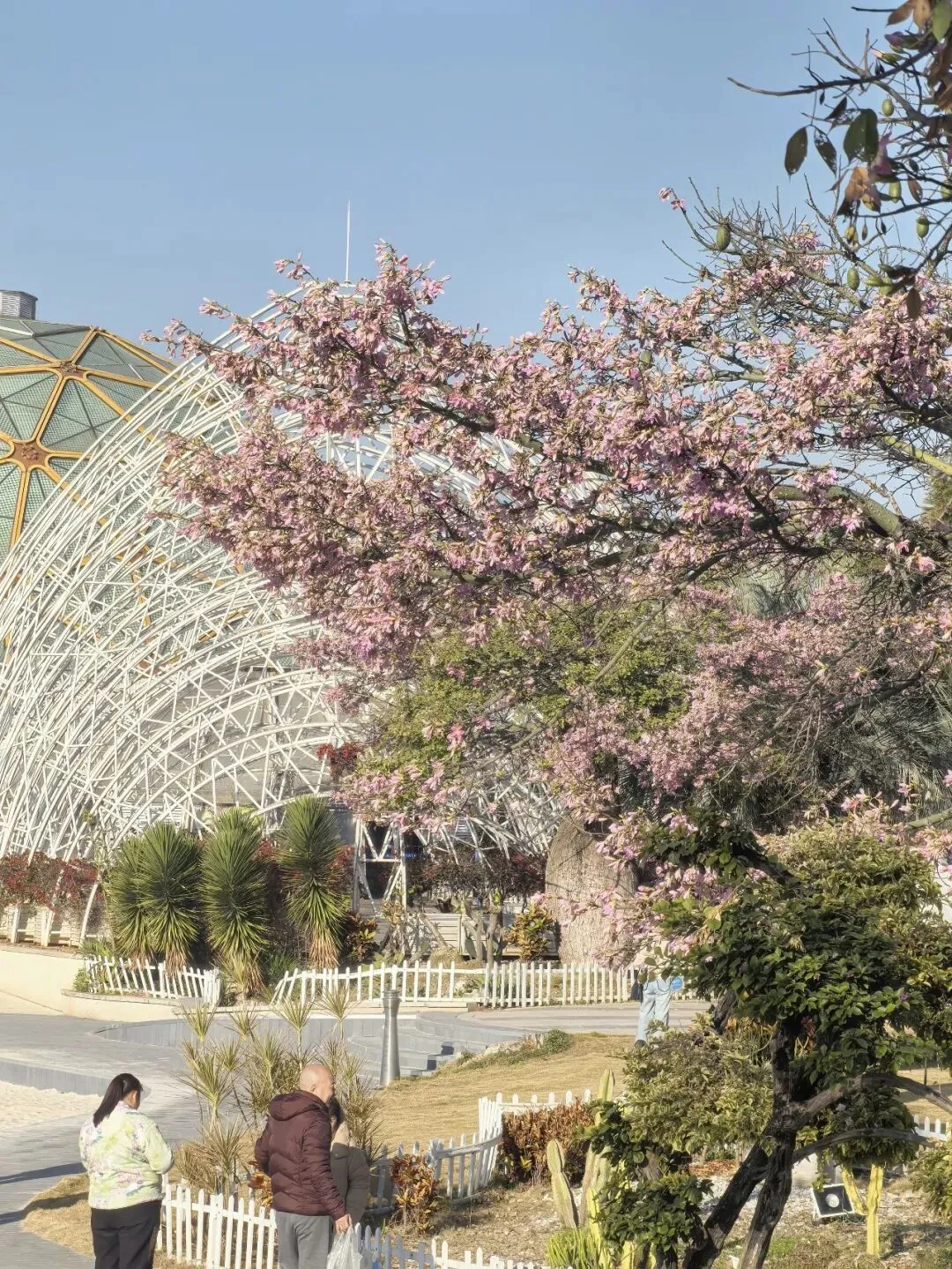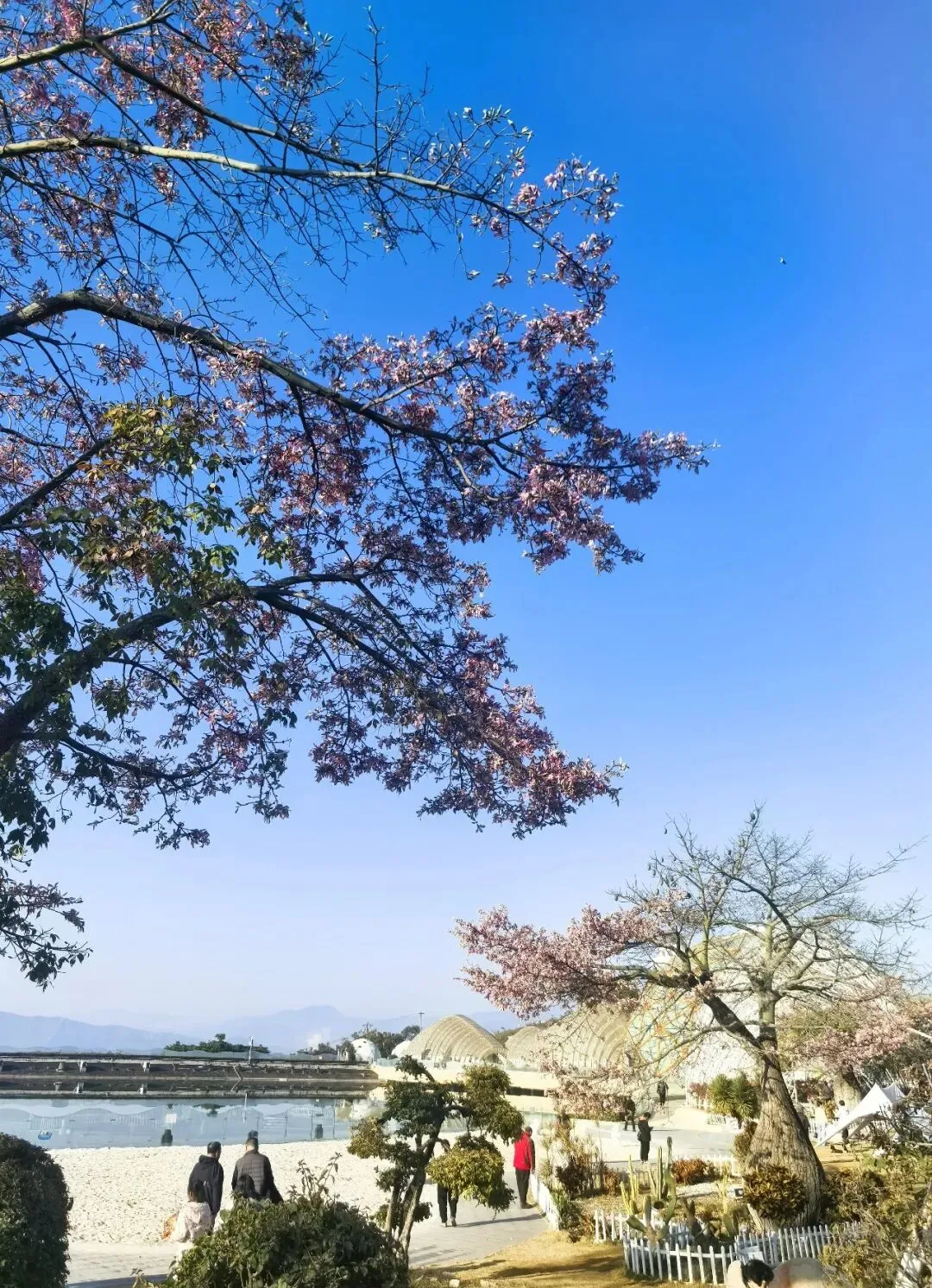 从米易县城驱车十余分钟,便驶入了太阳谷的环抱。车子沿盘山公路蜿蜒向上,窗外连绵青山与苍翠林木相映成趣,满目皆是清新。刚一下车,一方开阔的休闲广场与茵茵草地便映入眼帘,道路两旁,高大的异木棉正值盛放,花枝高耸入云,粉艳的花朵密密匝匝,将澄澈的蓝天晕染出一抹温柔的粉,花瓣精致繁茂,宛若粉色紫荆绽满枝头,浪漫至极。