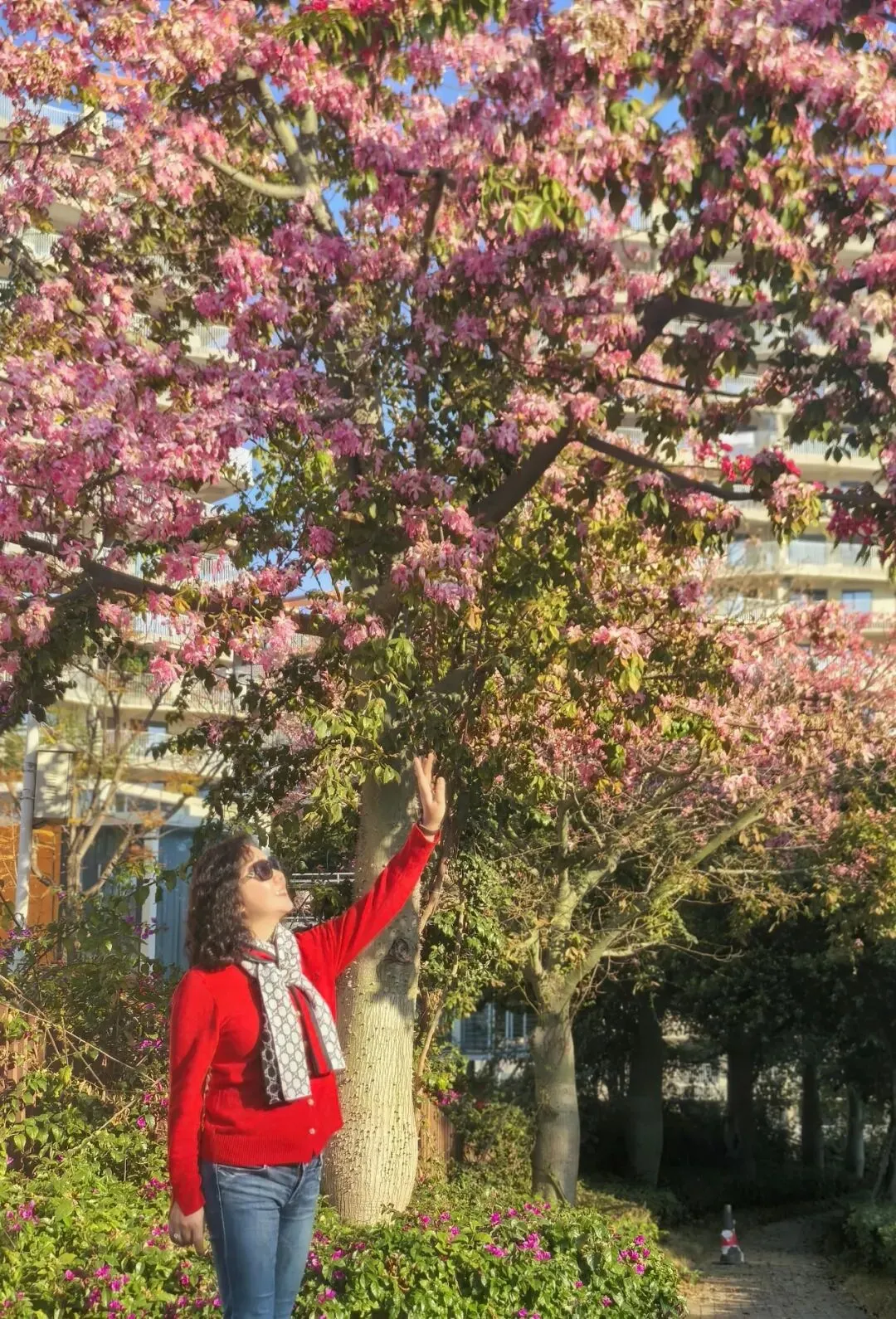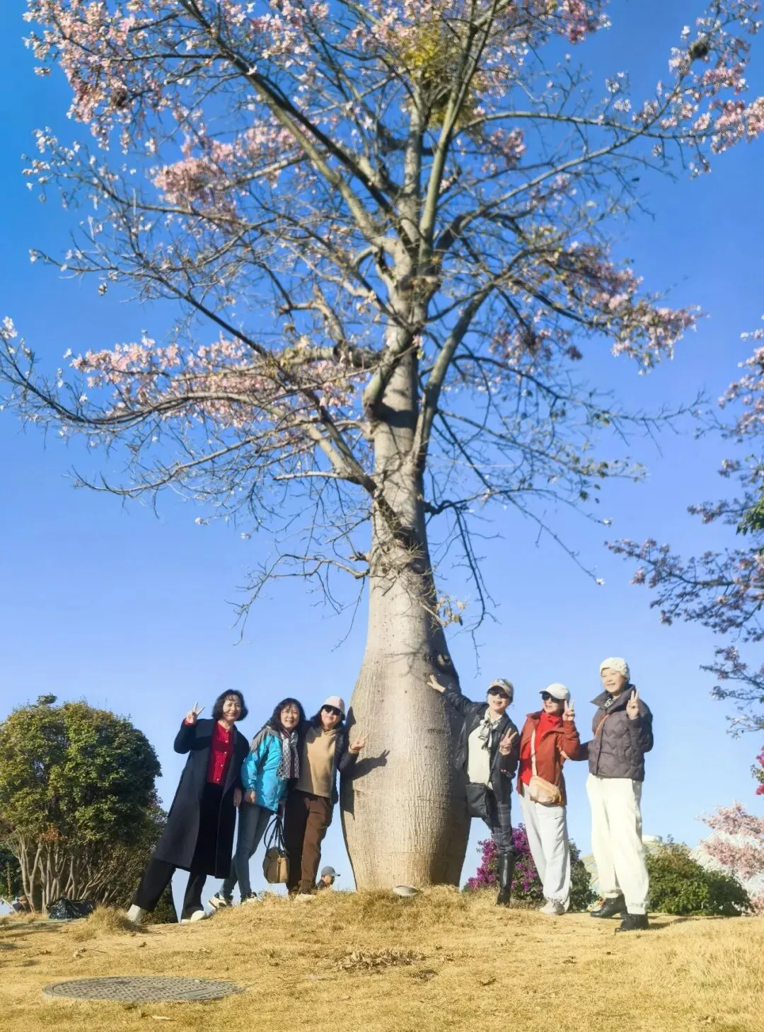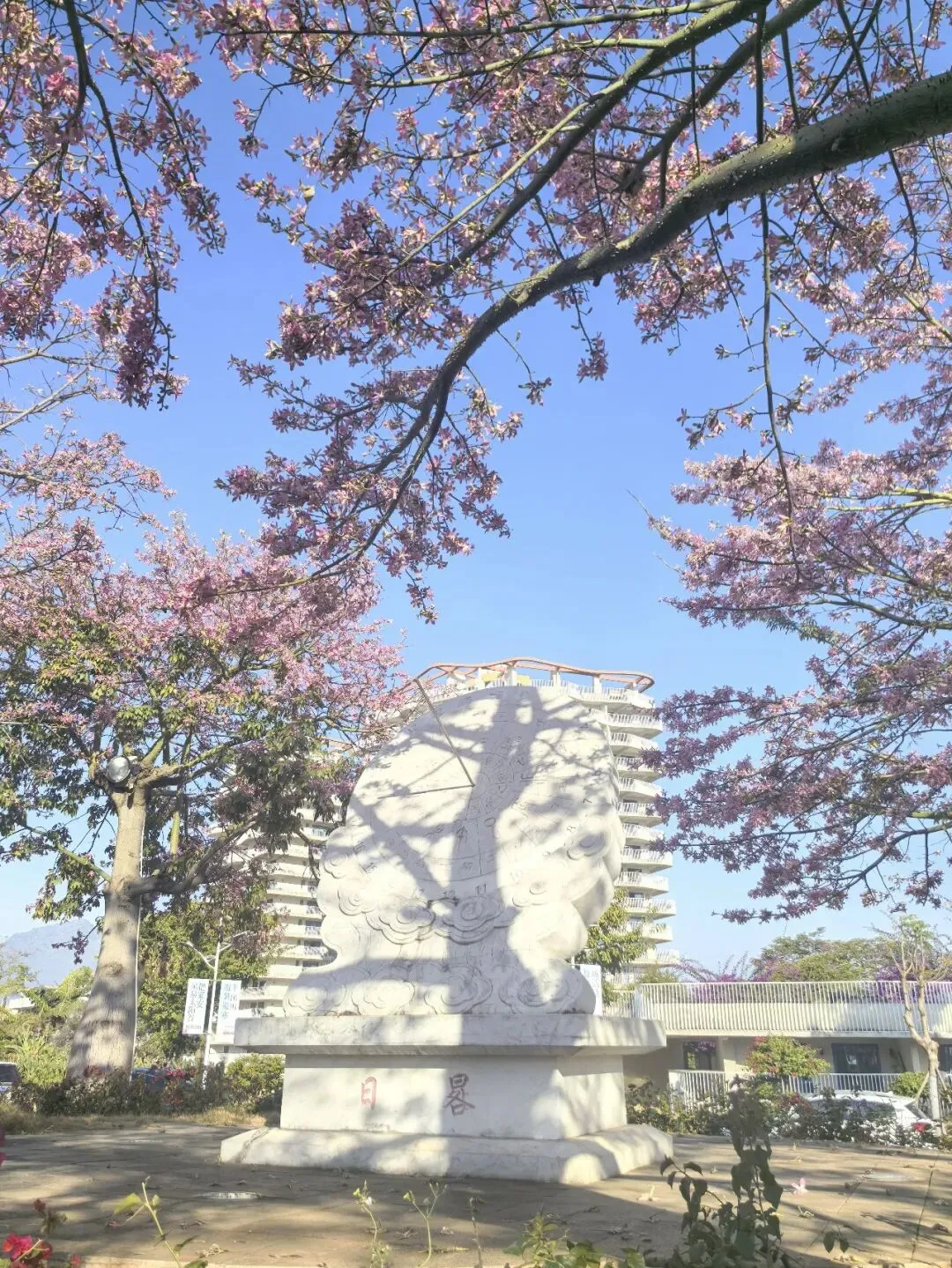 从米易县城驱车十余分钟,便驶入了太阳谷的环抱。车子沿盘山公路蜿蜒向上,窗外连绵青山与苍翠林木相映成趣,满目皆是清新。刚一下车,一方开阔的休闲广场与茵茵草地便映入眼帘,道路两旁,高大的异木棉正值盛放,花枝高耸入云,粉艳的花朵密密匝匝,将澄澈的蓝天晕染出一抹温柔的粉,花瓣精致繁茂,宛若粉色紫荆绽满枝头,浪漫至极。