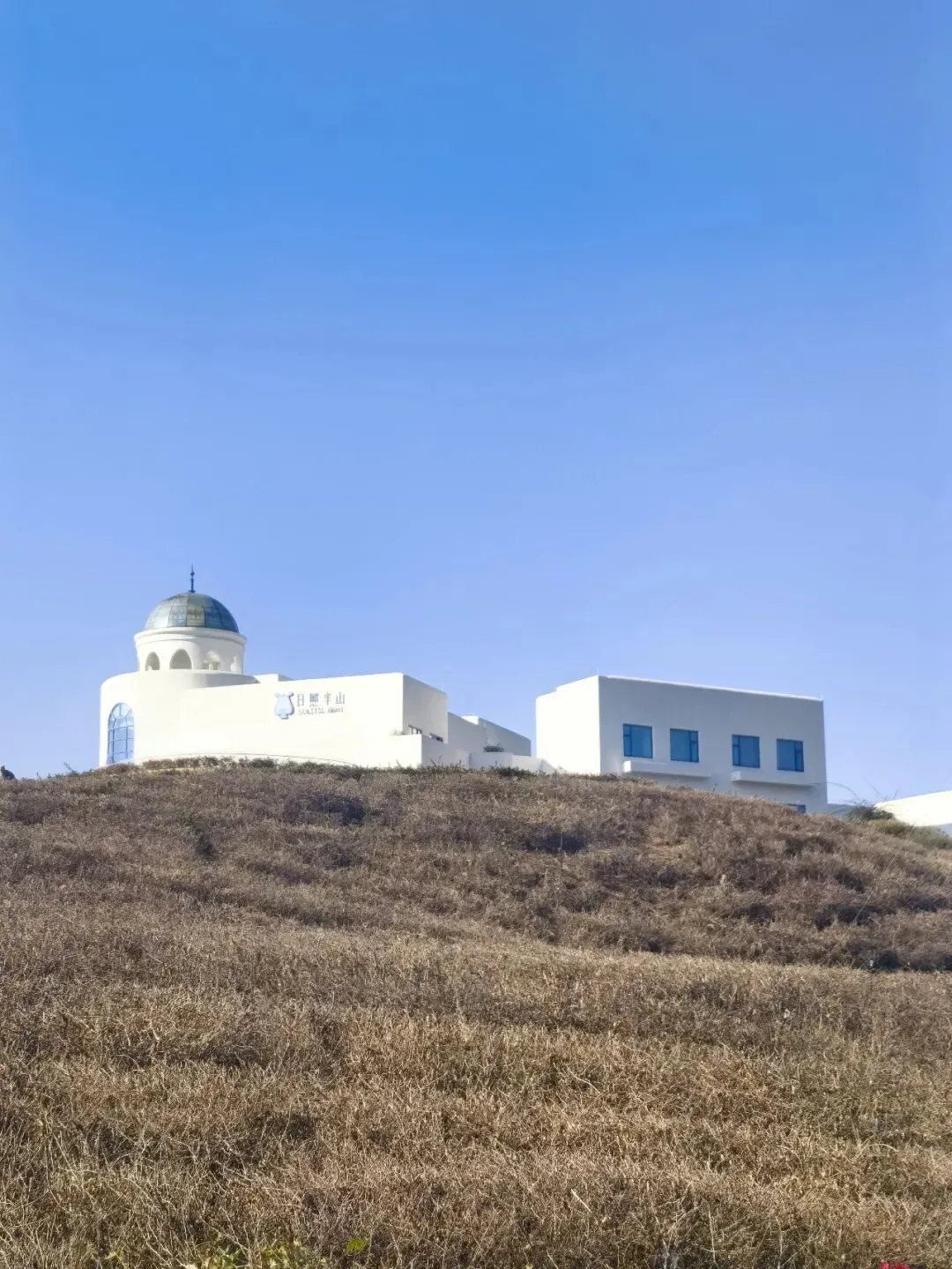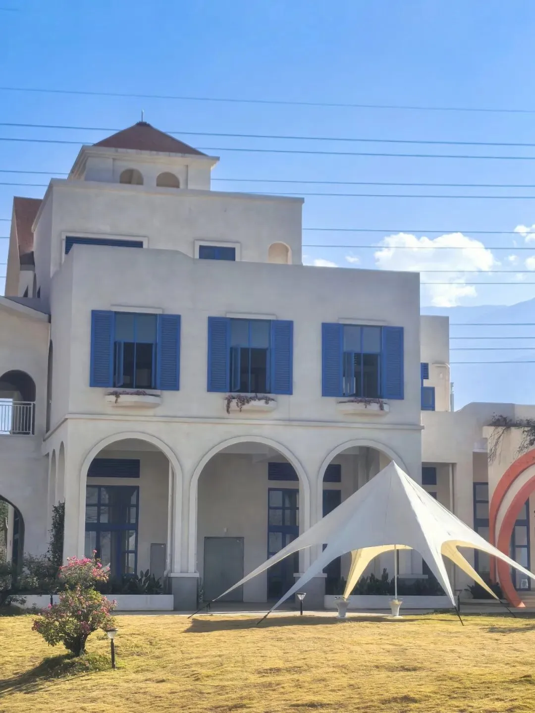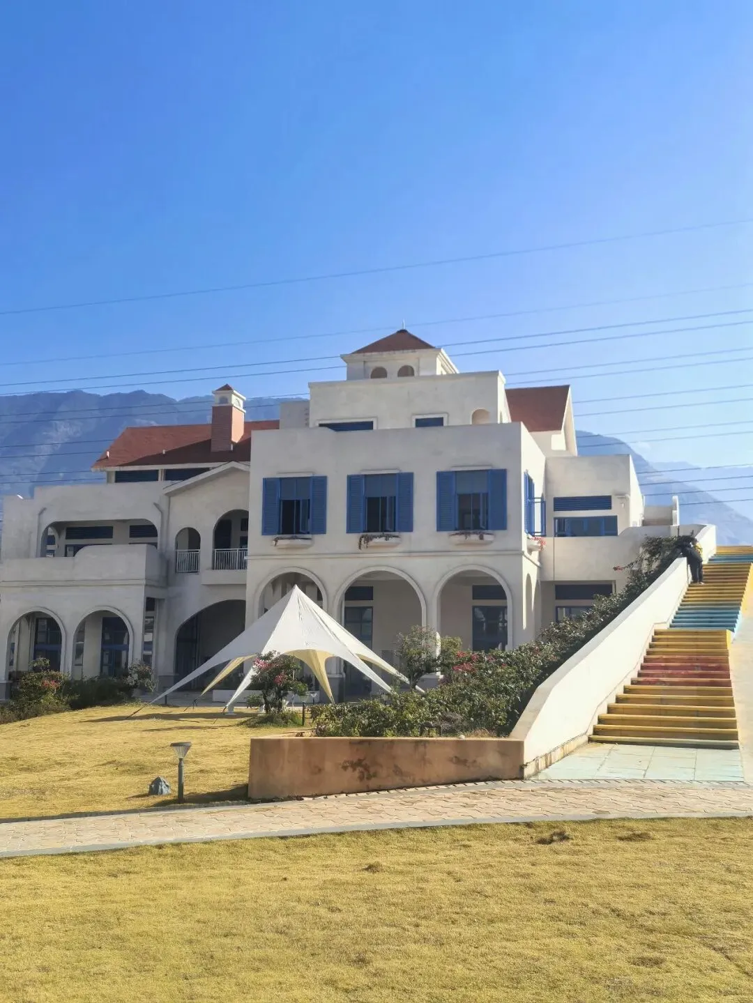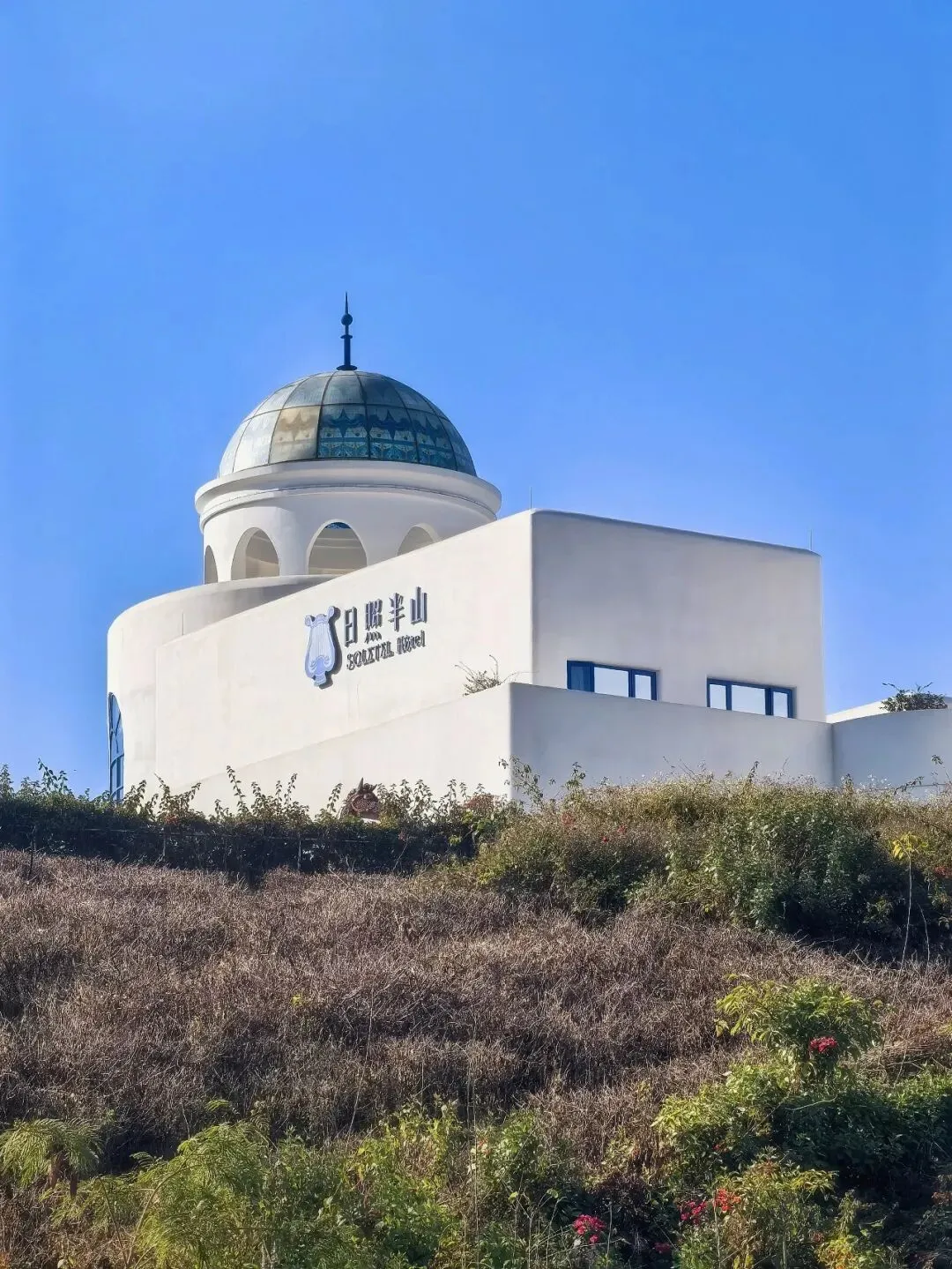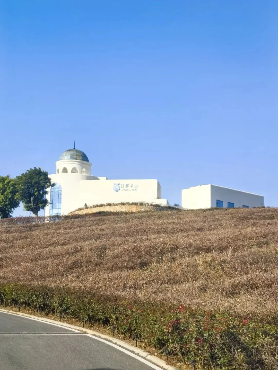 行至半山腰,目光骤然被一片蓝白建筑群吸引 —— 那是依山顶而建的日照半山酒店,满满的地中海与圣托里尼风情。错落的穹顶、清爽的蓝白配色,与远处的蓝天白云、脚下的青山梯田浑然相融,竟宛若将爱琴海畔的浪漫,悄然搬来了川西南的山谷之间。酒店占据着山顶的制高点,是网红打卡的胜地,晴好的阳光搭配澄澈蓝天,随手一拍便是地中海式的蓝白唯美画卷,可惜非住客不得入内,我们被拦在公路旁,只得借着延伸的公路,远远定格这份美好。