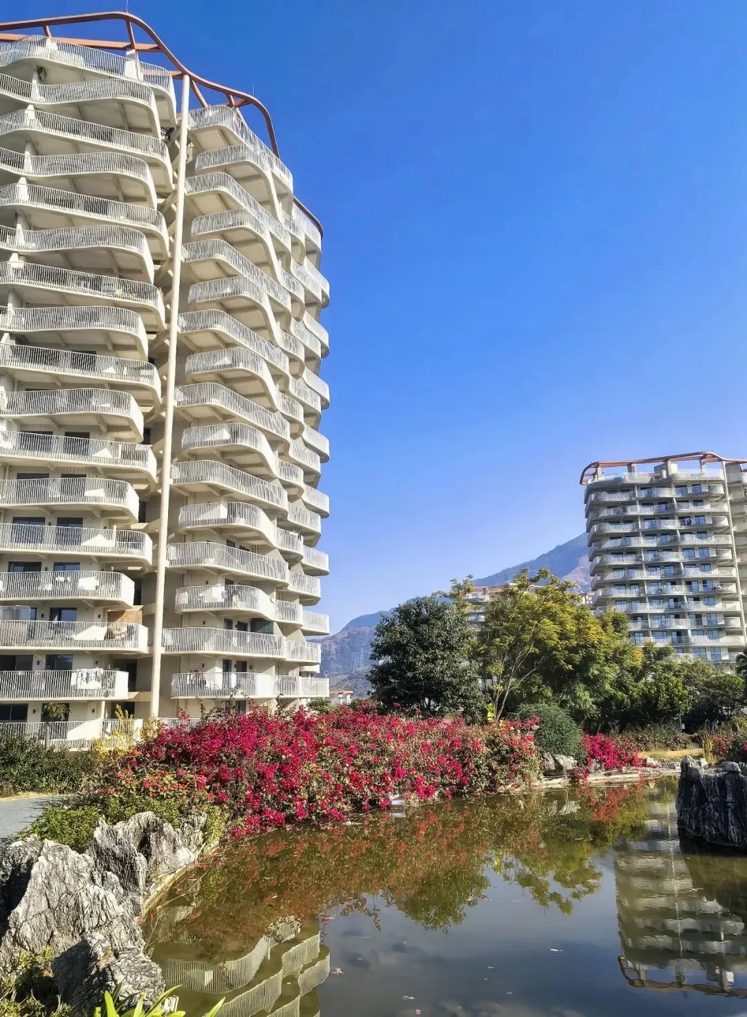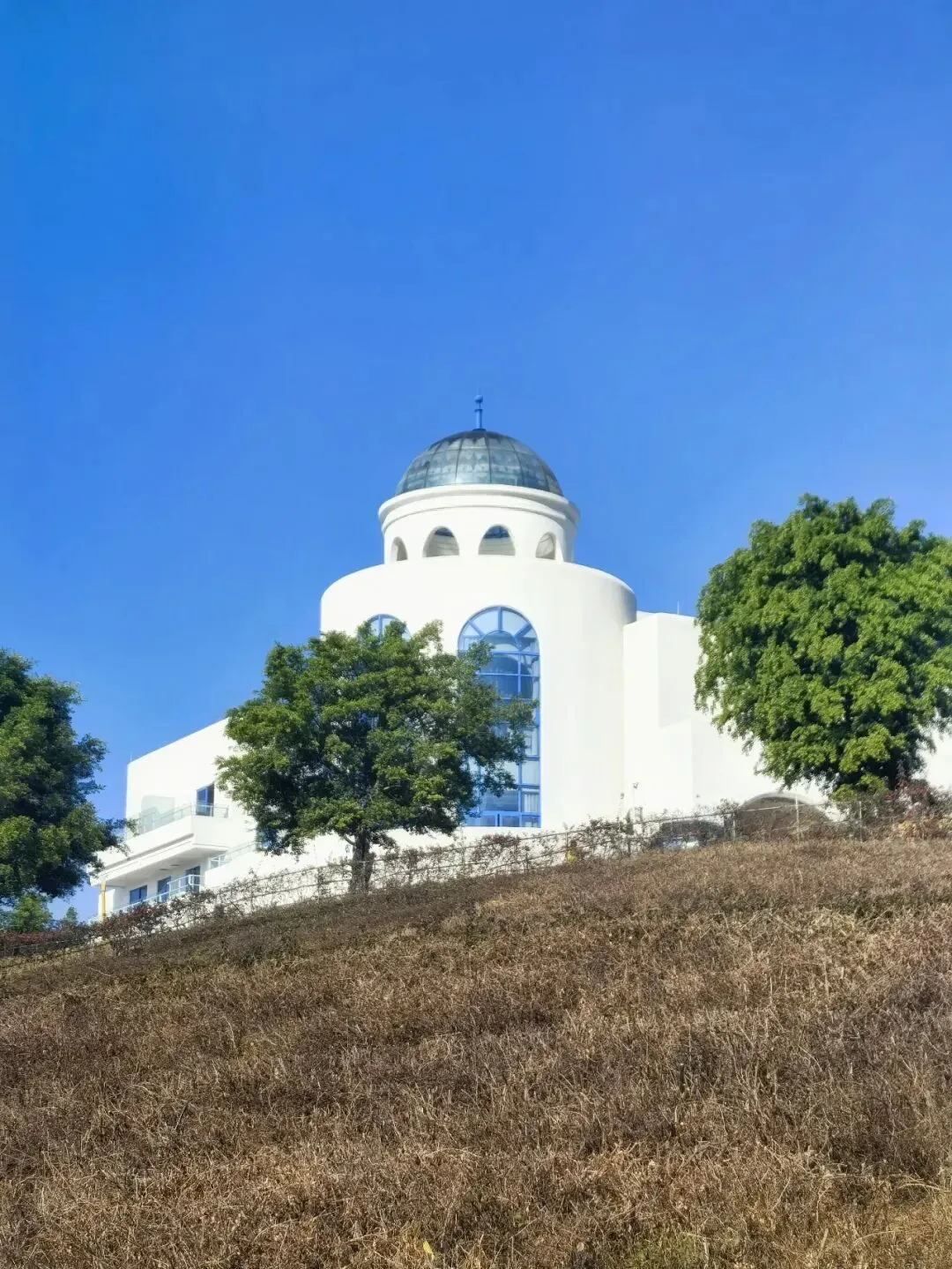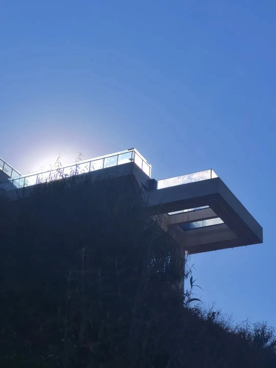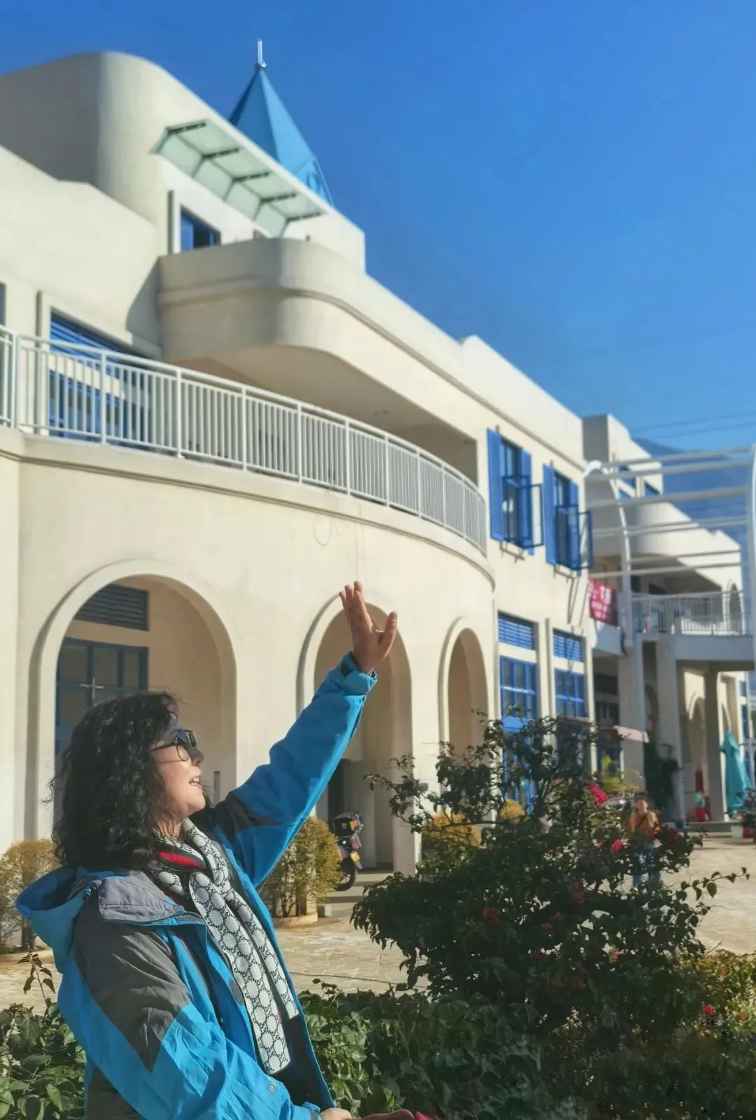 行至半山腰,目光骤然被一片蓝白建筑群吸引 —— 那是依山顶而建的日照半山酒店,满满的地中海与圣托里尼风情。错落的穹顶、清爽的蓝白配色,与远处的蓝天白云、脚下的青山梯田浑然相融,竟宛若将爱琴海畔的浪漫,悄然搬来了川西南的山谷之间。酒店占据着山顶的制高点,是网红打卡的胜地,晴好的阳光搭配澄澈蓝天,随手一拍便是地中海式的蓝白唯美画卷,可惜非住客不得入内,我们被拦在公路旁,只得借着延伸的公路,远远定格这份美好。