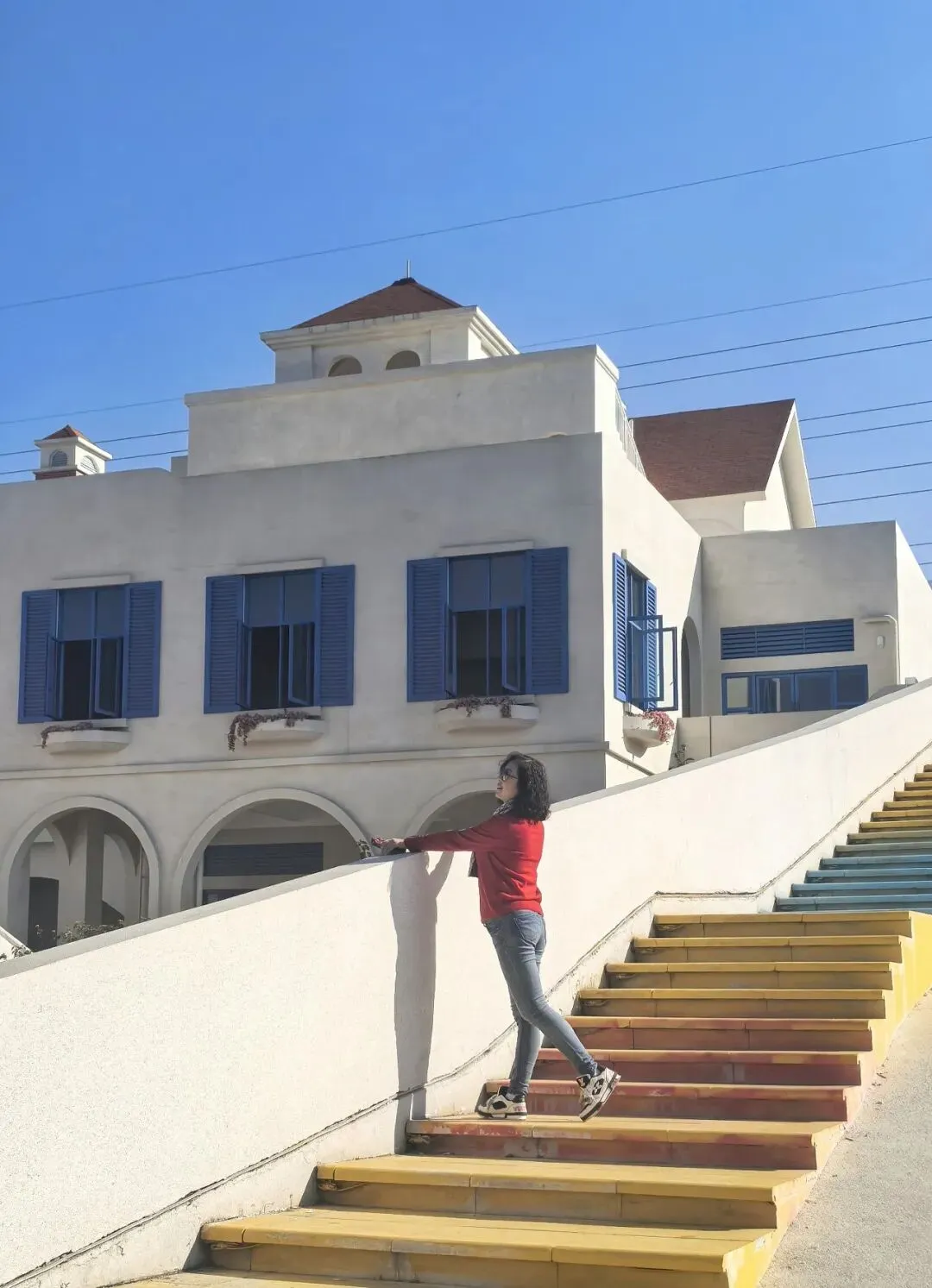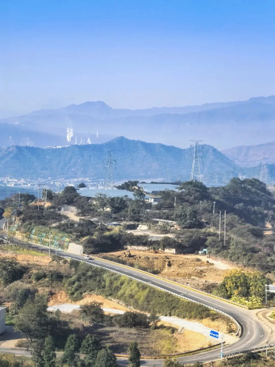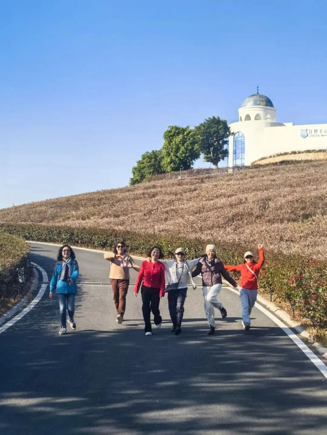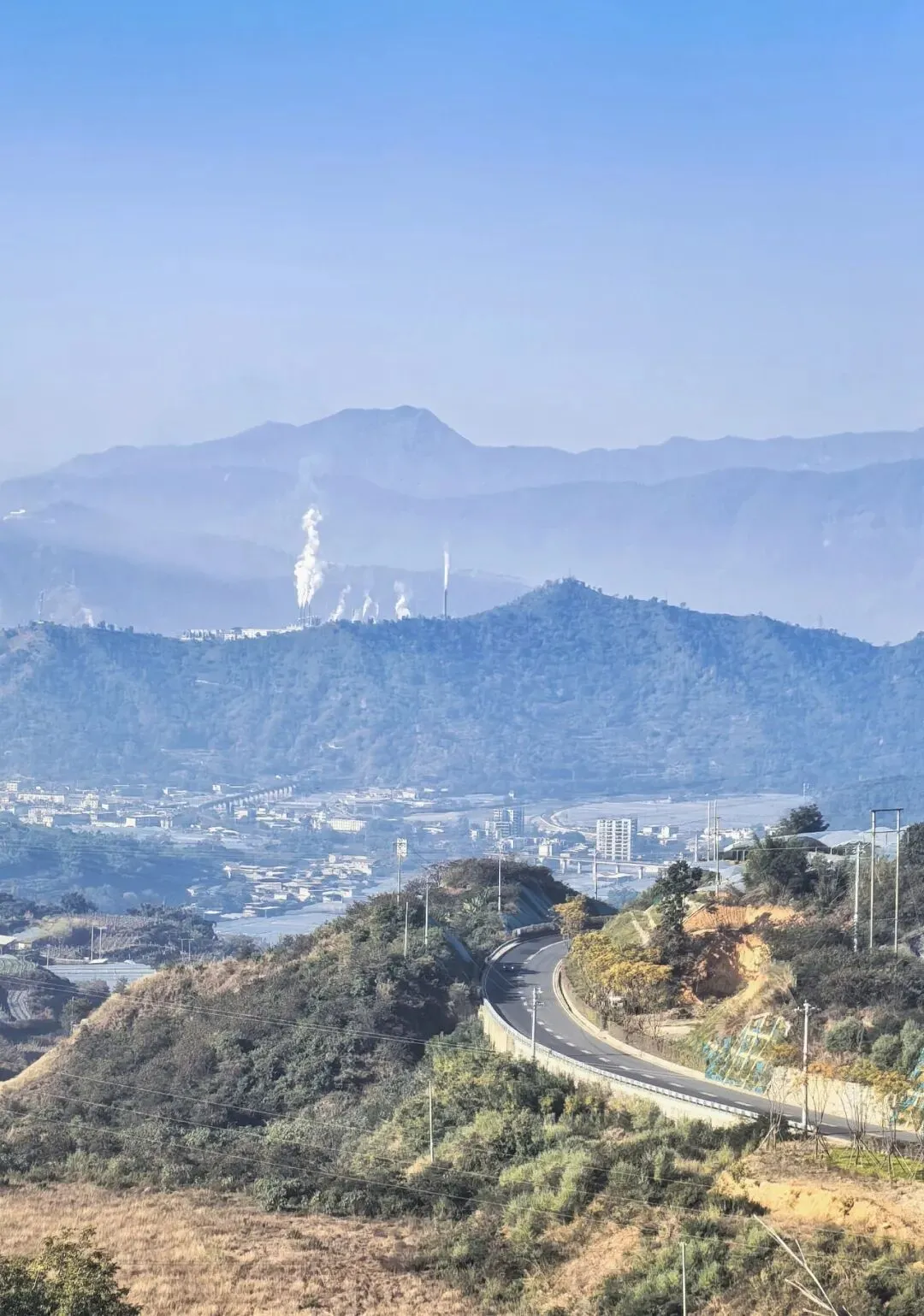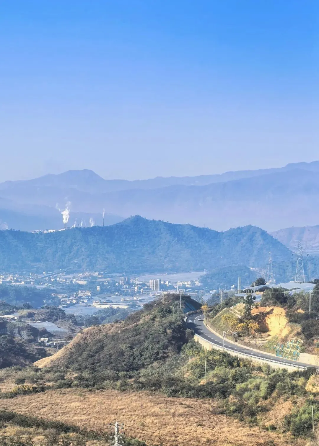 行至半山腰,目光骤然被一片蓝白建筑群吸引 —— 那是依山顶而建的日照半山酒店,满满的地中海与圣托里尼风情。错落的穹顶、清爽的蓝白配色,与远处的蓝天白云、脚下的青山梯田浑然相融,竟宛若将爱琴海畔的浪漫,悄然搬来了川西南的山谷之间。酒店占据着山顶的制高点,是网红打卡的胜地,晴好的阳光搭配澄澈蓝天,随手一拍便是地中海式的蓝白唯美画卷,可惜非住客不得入内,我们被拦在公路旁,只得借着延伸的公路,远远定格这份美好。