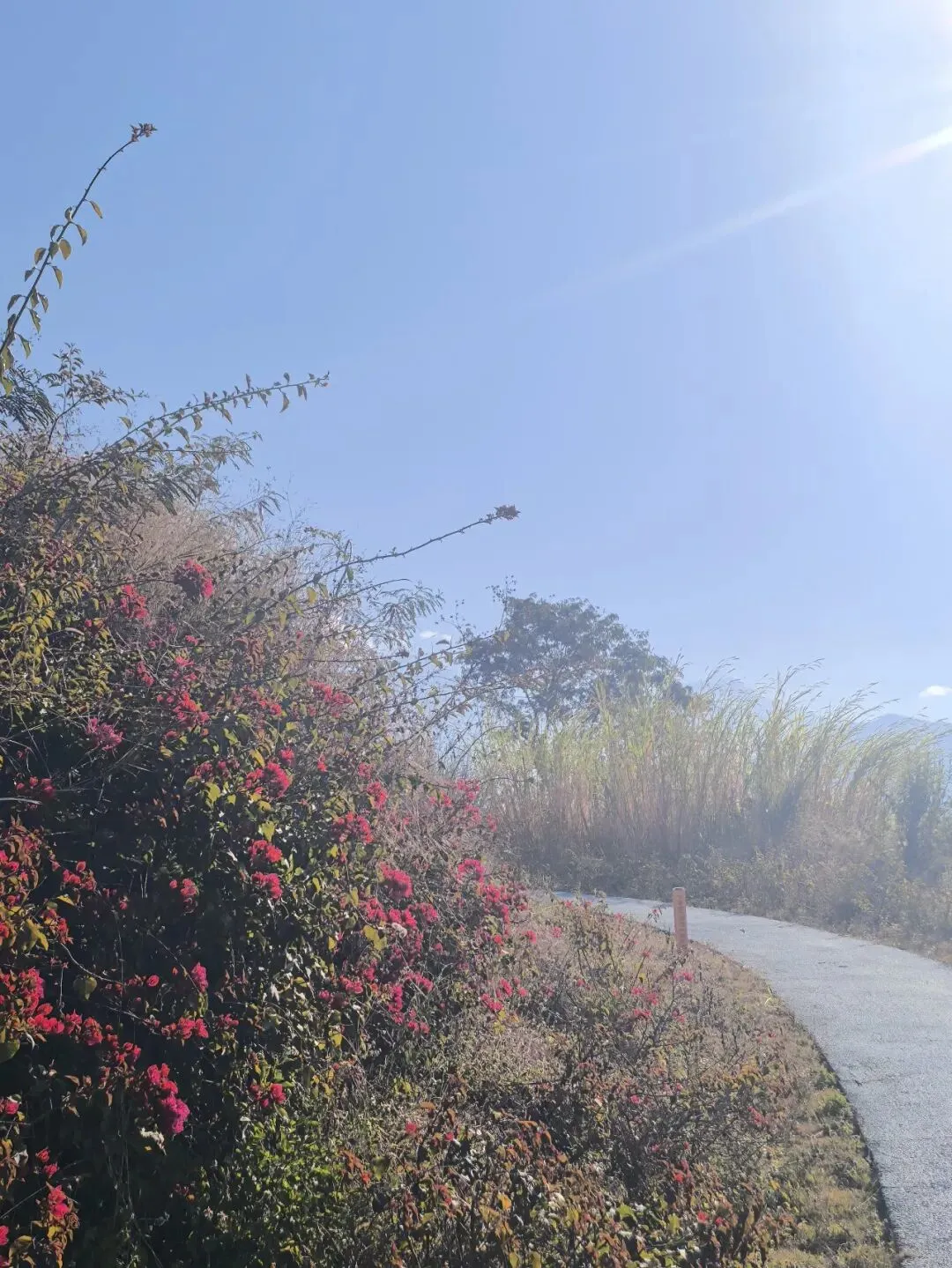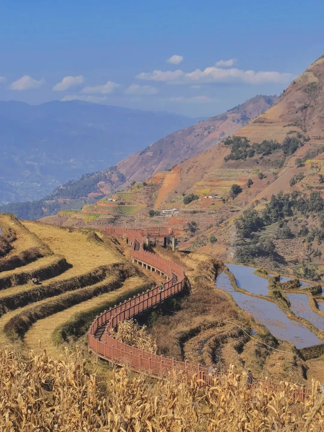 沿着游山栈道缓步前行,栈道两旁,三角梅热烈盛放,各色不知名的小花星星点点缀于其间,行至高处俯瞰,脚下的新山傈僳梯田层层叠叠,田埂顺着山势蜿蜒舒展,远处是米易城区的高楼与转动的风车,城市的烟火与山野的清幽错落相融,勾勒出一番别样的质朴韵味。