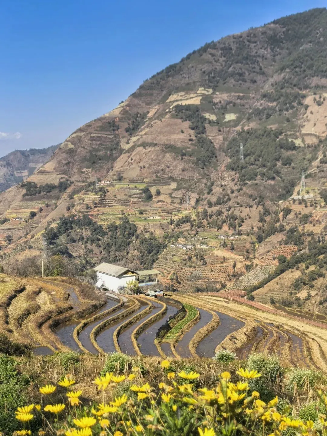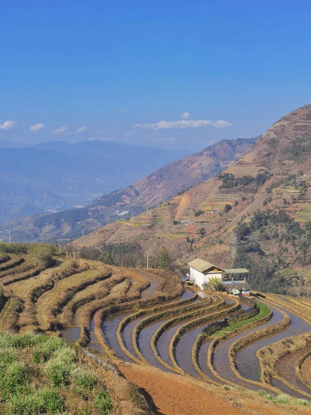 米易新山傈僳梯田景区,是国家4A级旅游景区,位于四川省攀枝花市米易县新山傈僳族乡新山村;从太阳谷出发,驱车二十余分钟便可抵达。梯田面积近2000 亩,错落分布在海拔1000–3000 米的山坡之上,坡度介于15°–75°之间,最高级数达千余级;傈僳先民在此开垦梯田,已有600 余年的历史,山顶水源林 — 盘山渠 — 梯田,构成了一套完整的生态循环灌溉系统,凝聚着先辈的智慧。虽是收割完毕的季节,只有部分梯田里留存着水迹,却丝毫未减这片土地的独特魅力。
