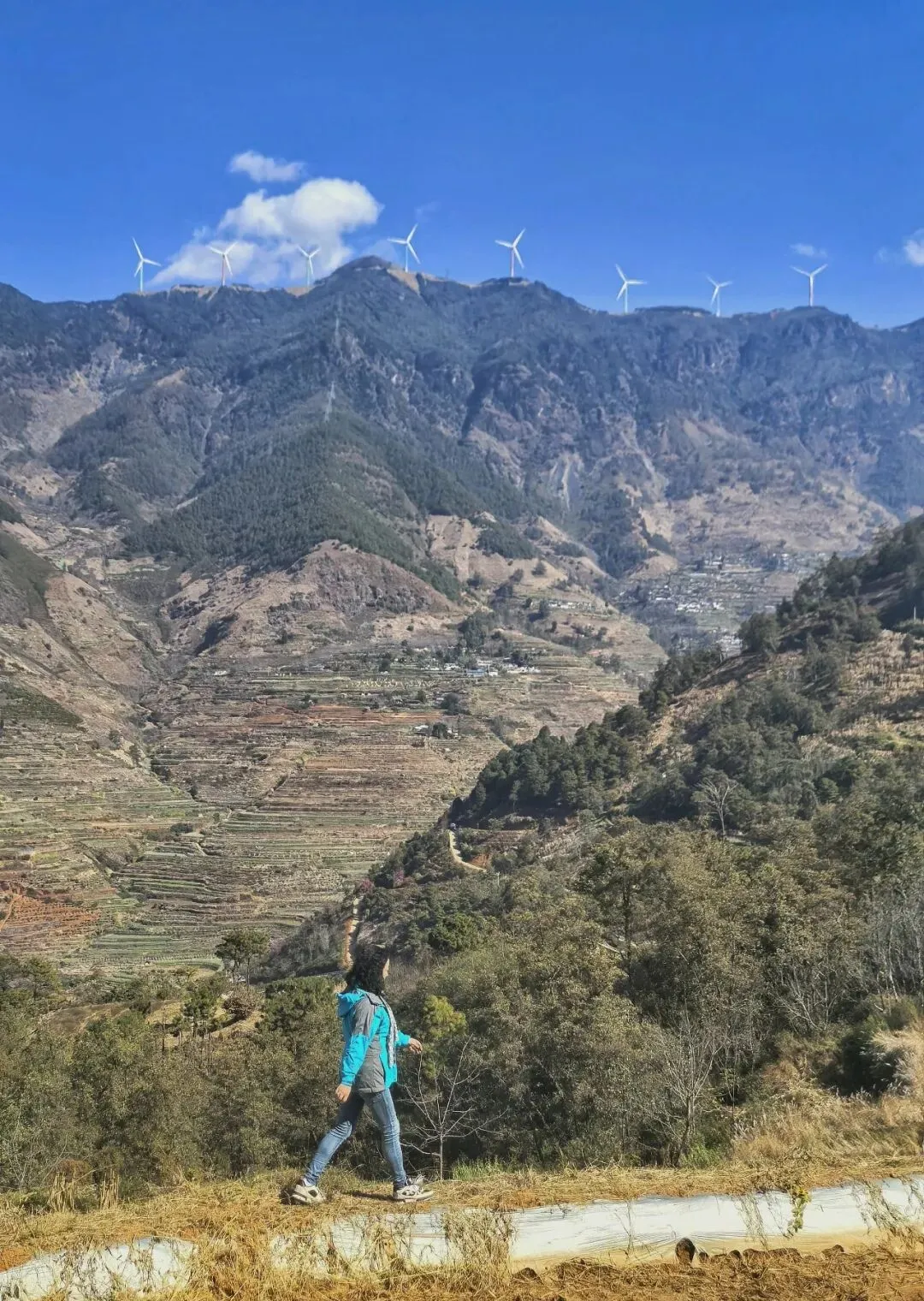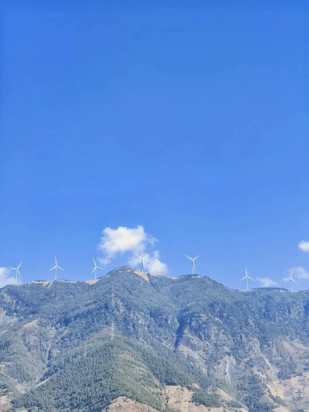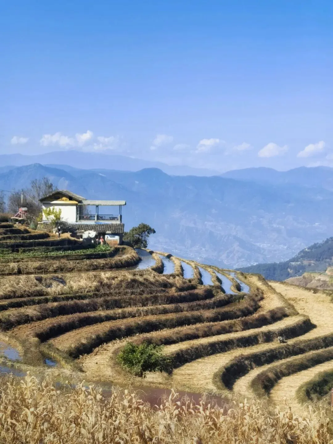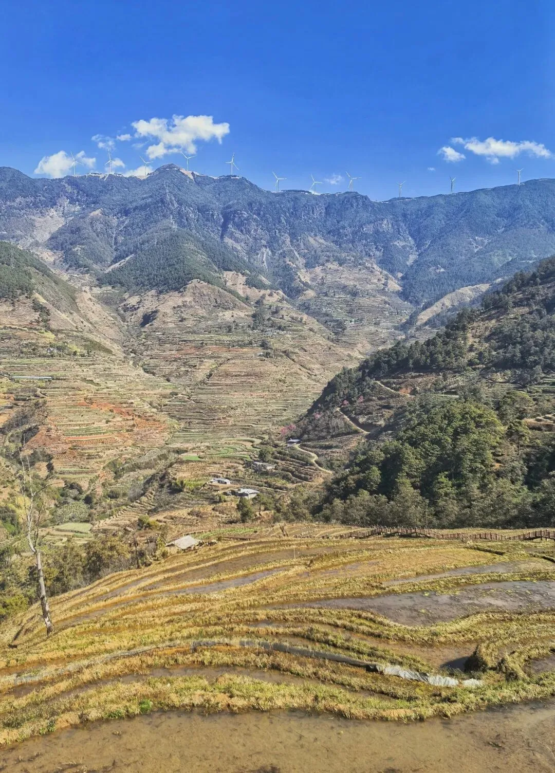 行至山腰,视线豁然开朗 —— 千余级梯田顺着龙肘山的山势层层铺展,从山脚绵延至山巅,山顶之上,是澄澈碧蓝的天空,还有一排排缓缓转动的白色风车,悠然自在。这方土地,是傈僳族人守护了六百余年的农耕秘境,没有刻意雕琢的景致,唯有大地的肌理与人类的耕耘相融共生,流露着最温柔的烟火气息。
