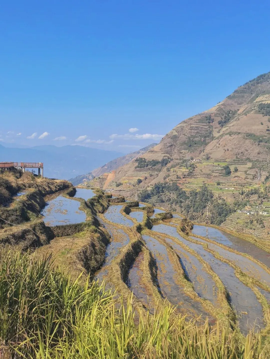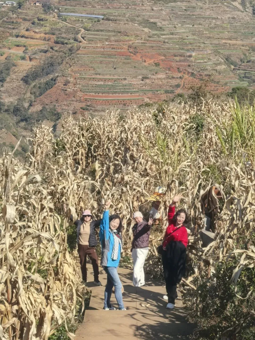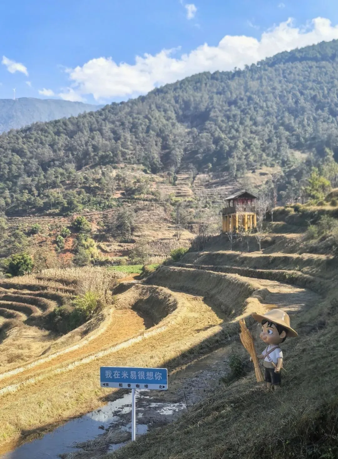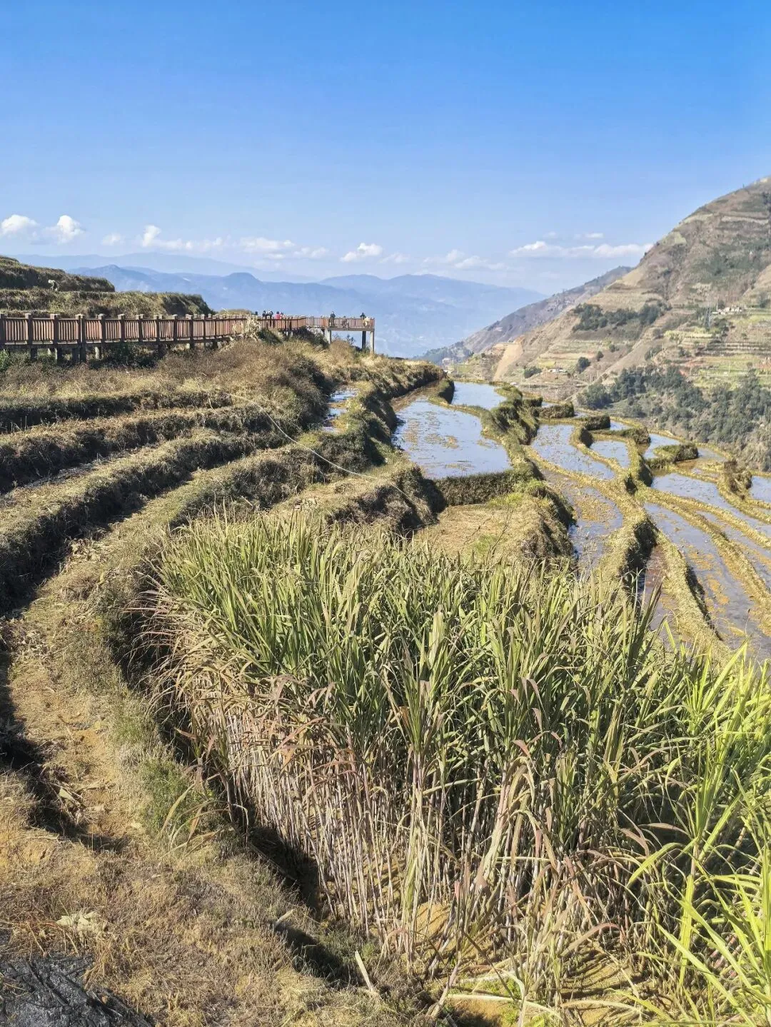我们沿观景栈道缓步而下,梯田的美,藏在最自然的肌理之中。脚下是平整的栈道,身旁的梯田依着山势坡度错落排布,线条婉转柔和。恰逢冬季,虽非梯田注水的唯美时节,也无丰收季的金黄盛况,游人寥寥,却独得一份清宁之美。田里的稻茬还留着去年丰收的金黄,一旁的甘蔗田长势繁茂,深绿的枝叶在风中轻摇,静静守候。阳光穿透云层,温柔地洒在层层田埂之上,光影交错间,将整片梯田晕染成了一幅写意山水画卷,笔墨清淡,却意境悠长。