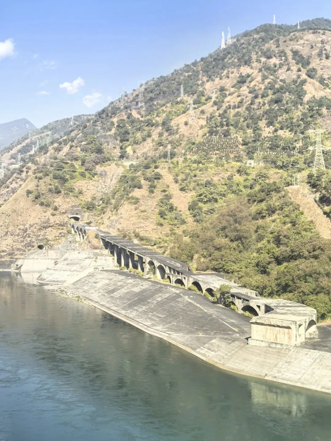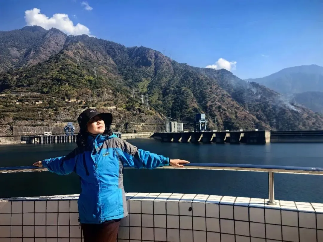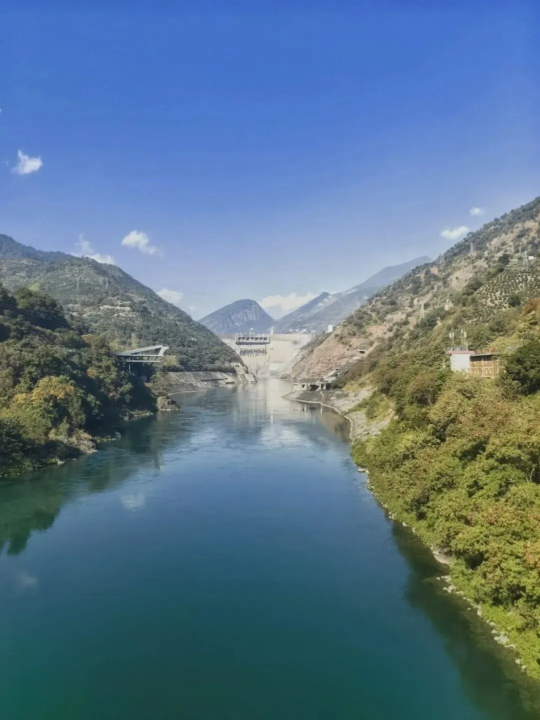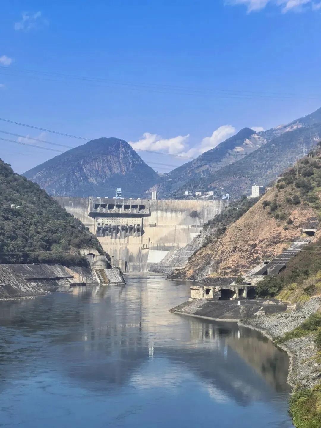 只需四元票价,拾级登上大坝观景台,峡谷间的清风穿堂而过,裹挟着江水的清冽与湿润,扑面而来。凭栏远眺,大坝的轮廓在阳光下愈发清晰,坝顶弧长近八百米,线条流畅而刚劲,如一把蓄势待发的巨弓横跨两岸,将滔滔江水温柔揽入怀中。脚下的雅砻江,褪去了往日的汹涌澎湃,化作一片静谧的湖泊,湖水湛蓝如剔透的宝石,清晰倒映着两岸的青山与天上的流云。望着坝体上整齐排列的泄洪孔道,不禁想象起夏秋季泄洪时的盛况:水流从百米高空奔涌而下,水雾冲天而起,声响如雷鸣贯耳,那等壮观景象,定是气势磅礴,动人心魄。