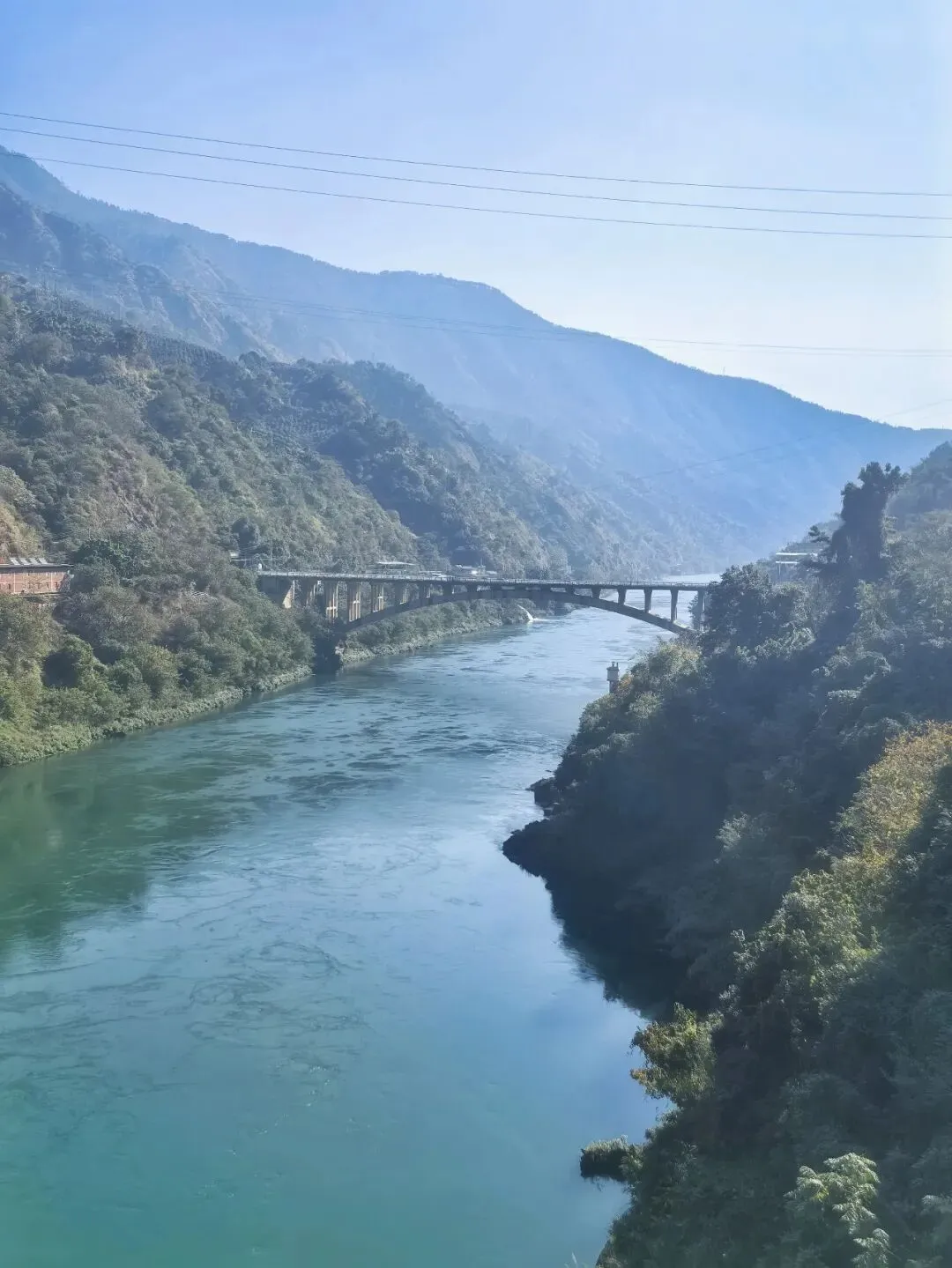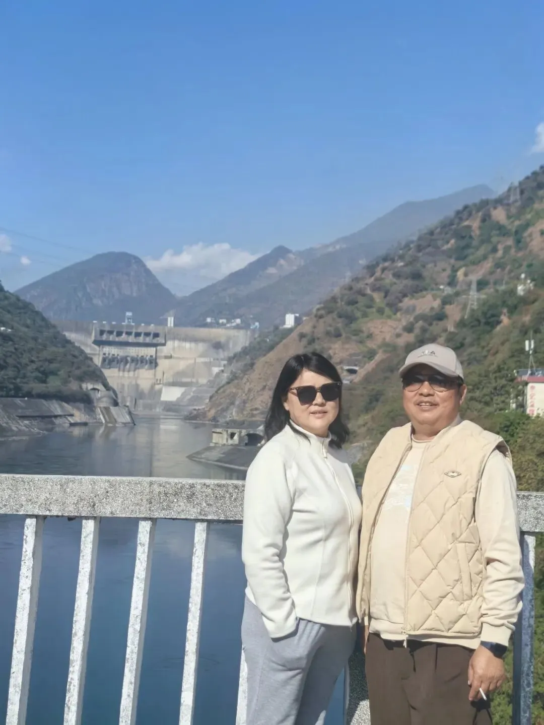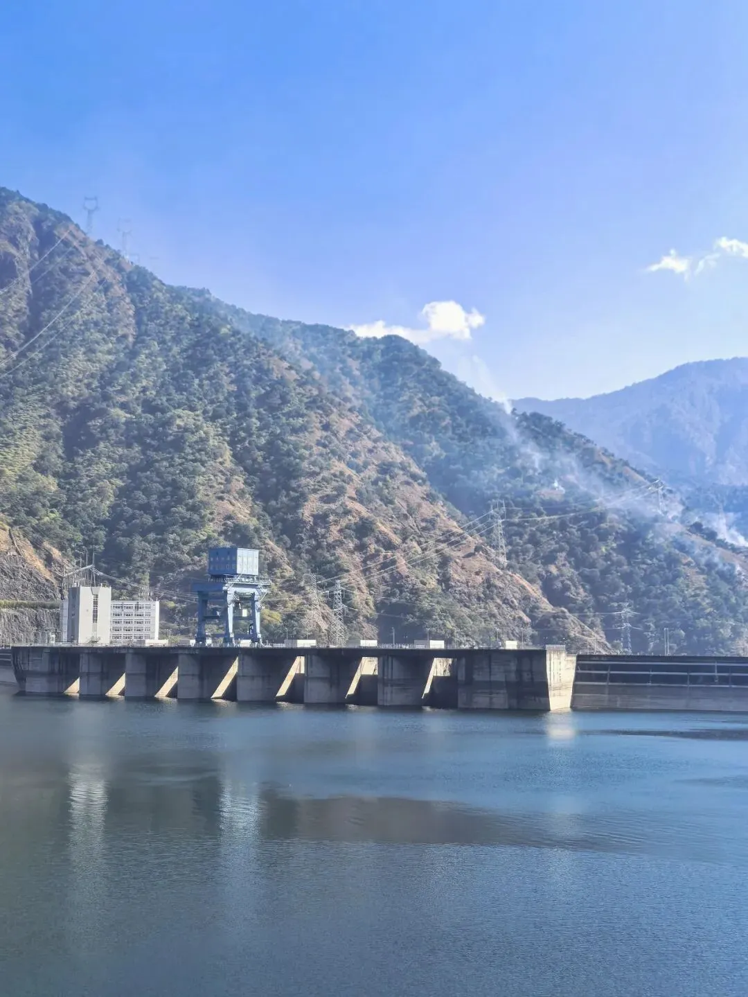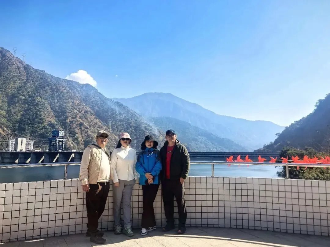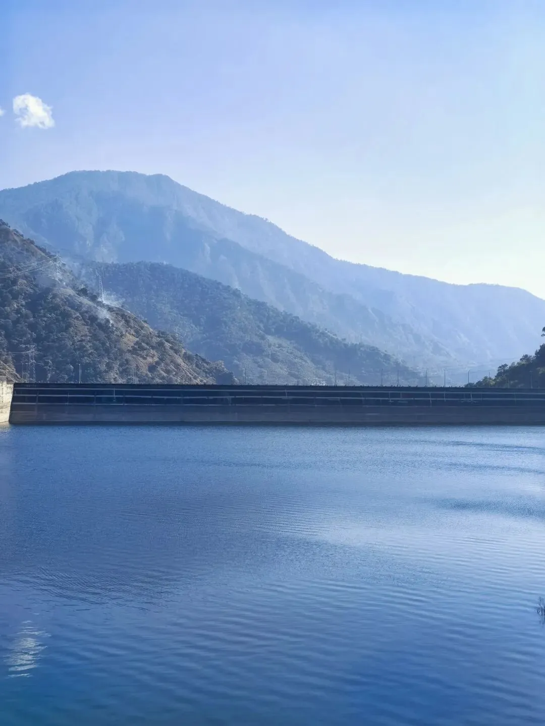 只需四元票价,拾级登上大坝观景台,峡谷间的清风穿堂而过,裹挟着江水的清冽与湿润,扑面而来。凭栏远眺,大坝的轮廓在阳光下愈发清晰,坝顶弧长近八百米,线条流畅而刚劲,如一把蓄势待发的巨弓横跨两岸,将滔滔江水温柔揽入怀中。脚下的雅砻江,褪去了往日的汹涌澎湃,化作一片静谧的湖泊,湖水湛蓝如剔透的宝石,清晰倒映着两岸的青山与天上的流云。望着坝体上整齐排列的泄洪孔道,不禁想象起夏秋季泄洪时的盛况:水流从百米高空奔涌而下,水雾冲天而起,声响如雷鸣贯耳,那等壮观景象,定是气势磅礴,动人心魄。