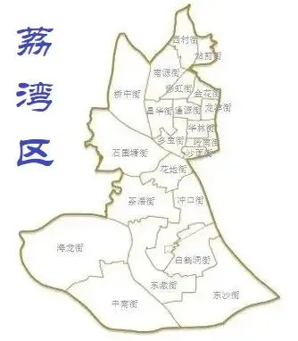 荔湾区辖22个街道:沙面街道、岭南街道、华林街道、多宝街道、昌华街道、逢源街道、龙津街道、金花街道、彩虹街道、南源街道、西村街道、站前街道、桥中街道、白鹤洞街道、冲口街道、花地街道、石围塘街道、茶滘街道、东漖街道、海龙街道、东沙街道、中南街道,区政府驻石围塘街芳村大道。