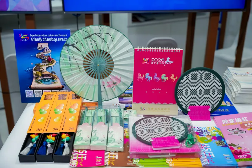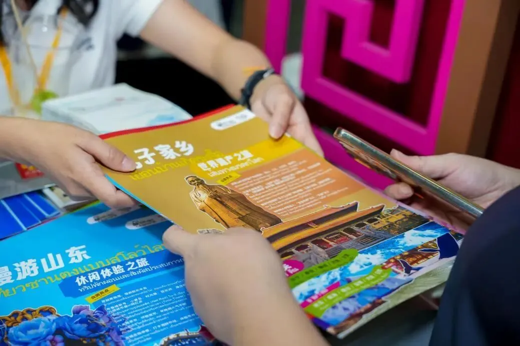 诚意满满宣传品和文创产品是旅游展的一大亮点。与《孤独星球》联名的《山东》轻旅行指南、《Timeout》定制版《来山东》折页、山东旅游地图等,涵盖中、英、泰等多语种,兼具实用性与观赏性。琉璃挂坠、鲁锦扇、“好客山东”行李牌等优质文创产品随展出海,受到热烈欢迎,展会期间一度“手慢无”。
