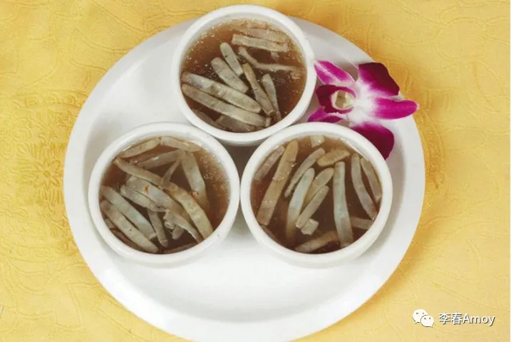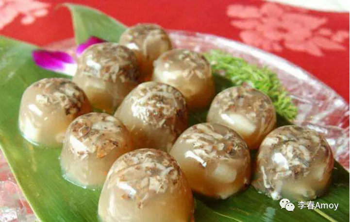 土笋冻也是厦门的特色小吃,但很多人都拒绝这一道美味的小吃,原因是它里面加入了沙虫,所以有的人看到这一道小吃可能会有一些恐惧感,但是我认为它真的非常的美味。土笋冻的表面看起来晶莹剔透的,透明靓丽。吃起来像是果冻一样非常的有嚼劲,入口瞬间极化,冰凉感十足,搭配着厦门人民特制调配的酱料一起食用,会更好吃。