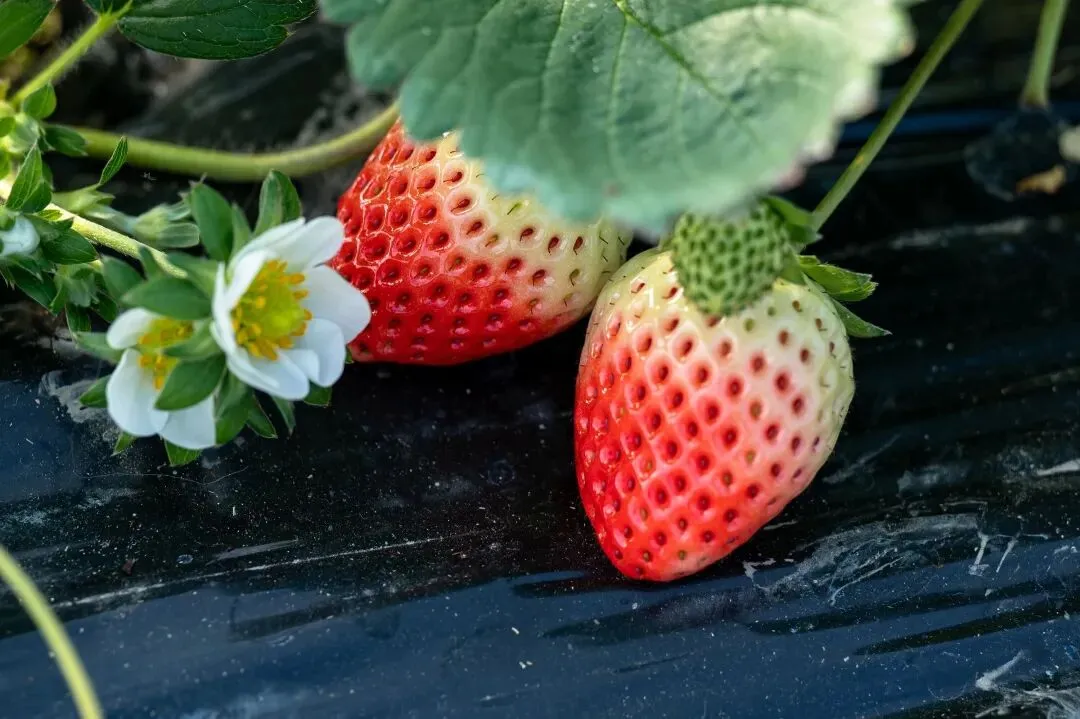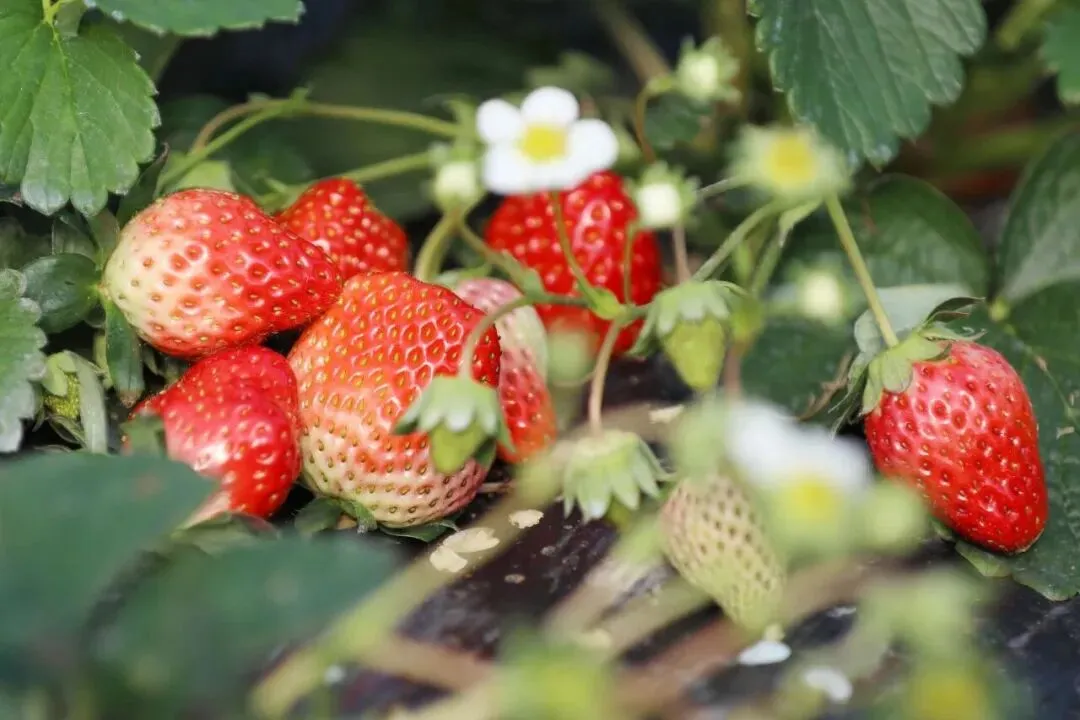 午后可以自驾前往米食米客果蔬园,打卡“草莓彩虹基地”,红、白、粉、黄、橙、黑6种颜色草莓颜值爆表,每种口味各有特色。