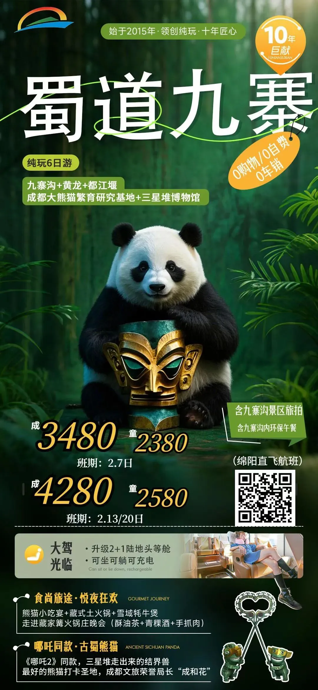 🌟 【蜀道九寨·纯玩尊享】九寨沟+黄龙+熊猫基地+三星堆6日深度游🌟