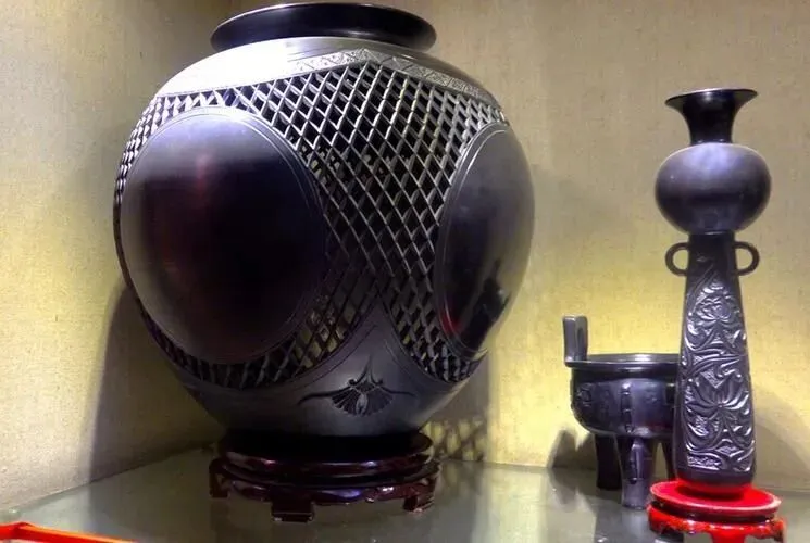 龙山黑陶,章丘那边的。4000多年前的老祖宗就开始做了,比什么日本陶艺早了不知道多少辈。黑得发亮,薄得透光,敲一下叮当响。