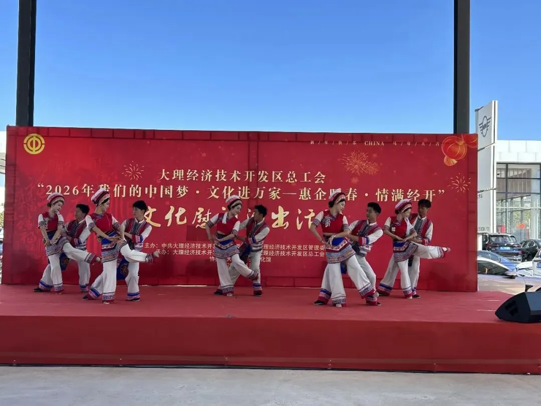 2026年1月23日,大理旅游集团洱海游船分公司艺术团受邀参加由大理经济技术开发区总工会主办的“2026年我们的中国梦·文化进万家——惠企暖春·情满经开”文化慰问演出活动,为基层一线职工和群众送去了一场充满民族风情的文化盛宴。