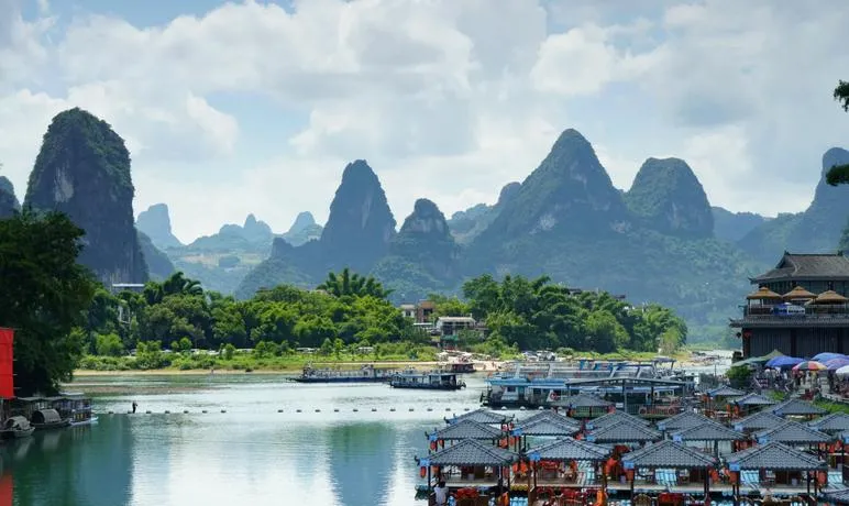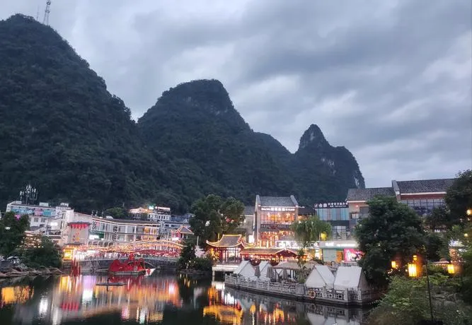 遇龙河的竹筏跟漓江那种大船不一样,就是真的竹子绑的筏子,一个筏子坐两个人,一个撑筏子的师傅,在河上漂一个多小时,很多人觉得这个项目就是拍拍照看看景,其实坐竹筏最直接的感受是你跟水之间没什么隔阂了,大船的话你站在甲板上,水在下面,你在上面,中间隔着船体和栏杆,竹筏不一样,你坐在上面,脚边就是水,手一伸就能摸到,筏子过浅滩的时候能听到竹子跟石头摩擦的声音,能感觉到水流顶着筏子的力道。
