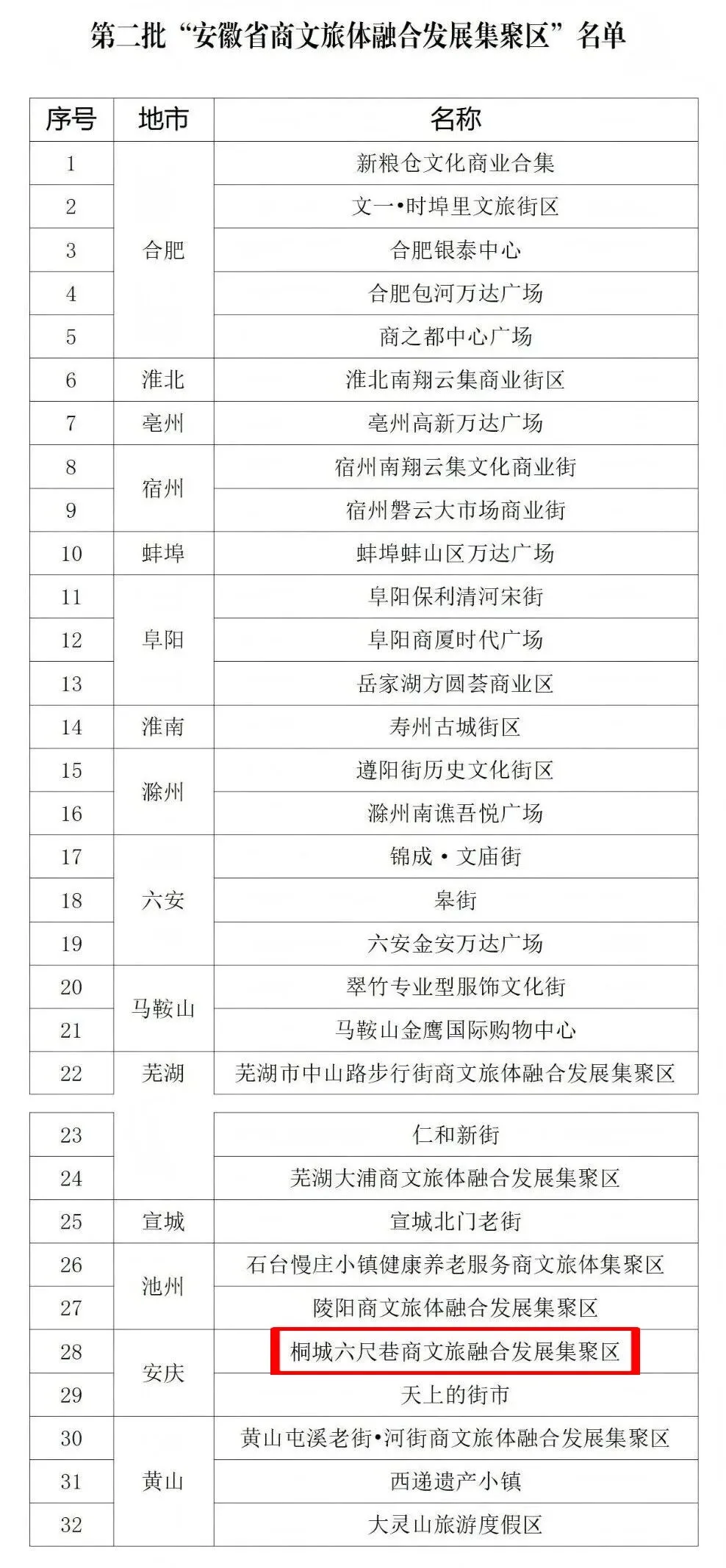 日前,安徽省商务厅联合省发展和改革委员会、省文化和旅游厅、省体育局共同公布第二批“安徽省商文旅体融合发展集聚区”名单,桐城六尺巷景区成功入选。