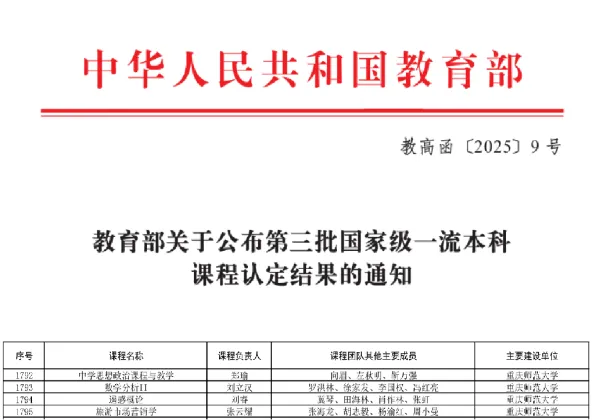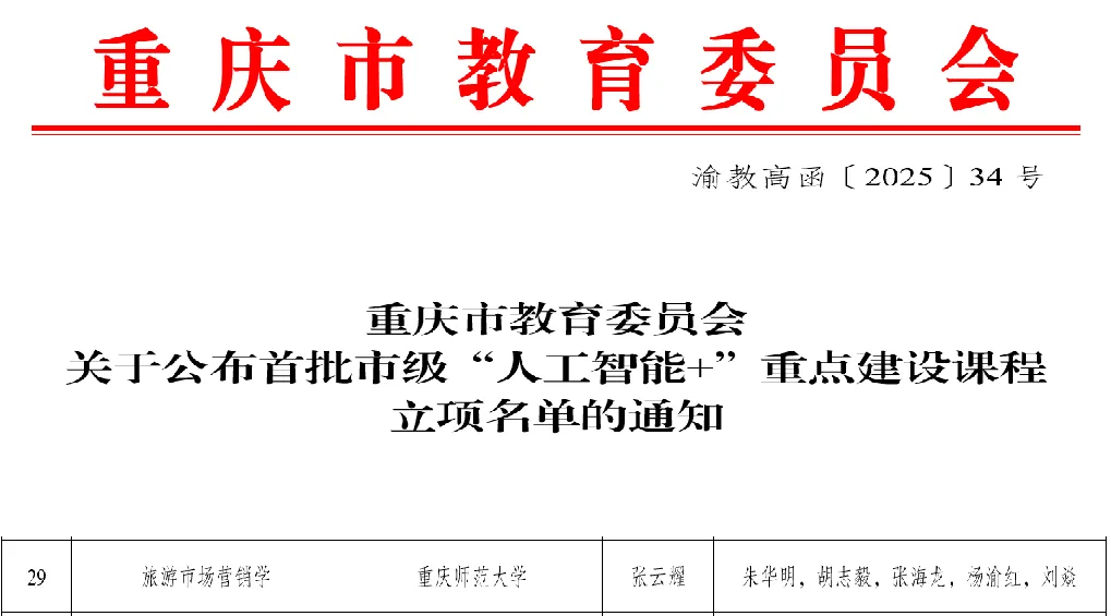 《旅游市场营销学》获批国家一流课程,获批重庆市一流课程2门、重庆市首批“人工智能+”重点建设课程1门。团队成员参与获得重庆市教学成果奖特等奖1项、二等奖1项,牵头获得校级教学成果奖特等奖1项、二等奖2项,为智慧旅游人才培养提供了坚实的基础。
