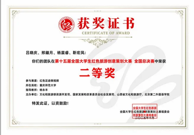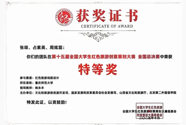 获得第十五届全国大学生红色旅游创意策划大赛总决赛特等奖1项,二等奖1项;重庆市大学生乡村振兴创意大赛特等奖2项,一等奖2项;重庆市大学生研学旅行创意策划大赛一等奖2项,全年获得省部级以上学科竞赛奖励近50项。相关成果受到中国日报网、中国旅游新闻网的报道,中国文化报、中国旅游报和央广网的深度报道。将课堂延伸到祖国大地,产出了可视化、可传播的创意成果,学科竞赛成为专业发展的“加油站”。