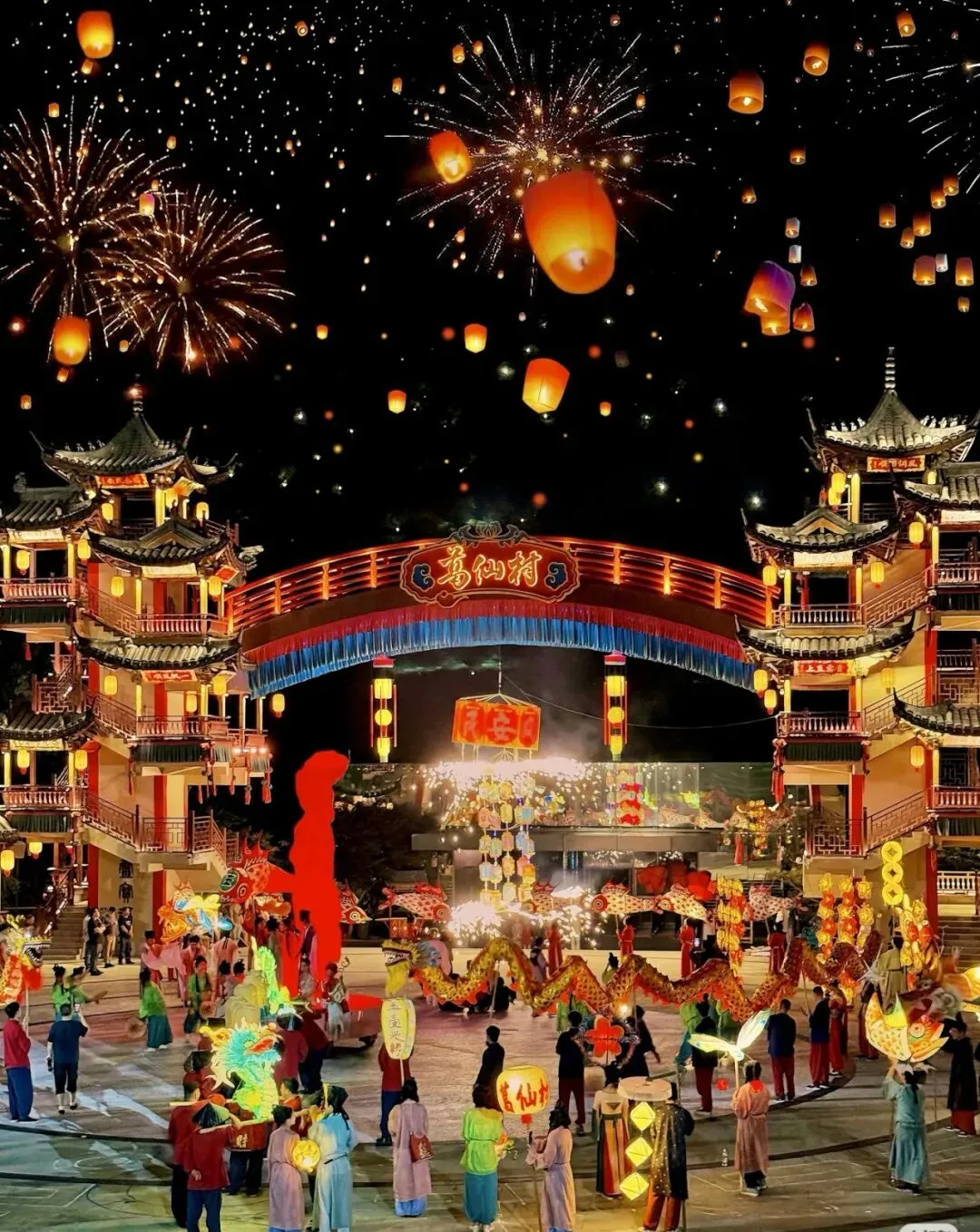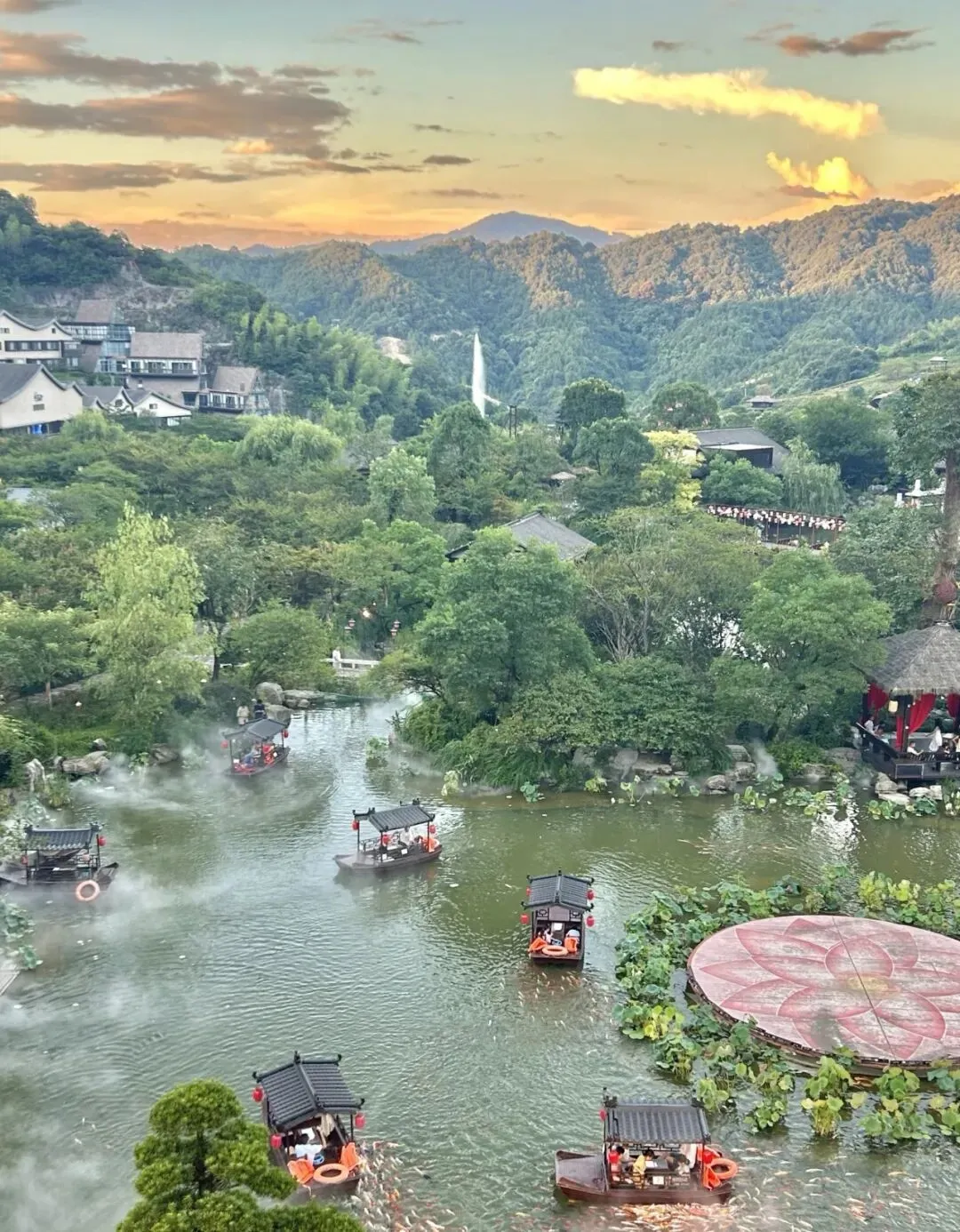 葛仙村是藏匿于群山之中的“逍遥处”,以道教文化为核心,打造出一幅唐宋时期的生活画卷。这里的灵宝仙街灯笼摇曳,青瓦白墙间茶香袅袅,身着汉服的游人款款而行,与古色古香的建筑相映成趣。