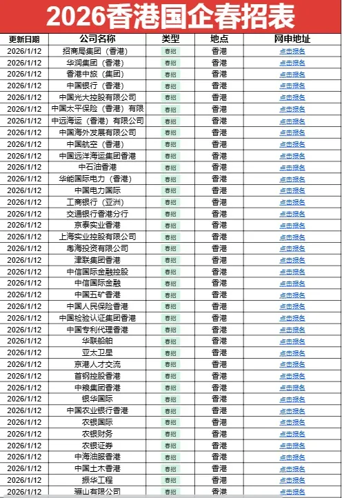 精选香港在招央国企岗位汇总表 实时在线更新 点击报名,直达企业官网 查看岗位详情及投递简历扫码关注港职HK 回复暗号【香港国企】 查看获取表格方式