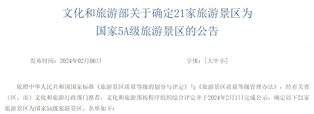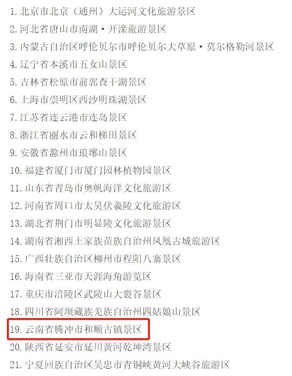 您现在的位置是:首页 > 国内旅游目的推荐 > 正文 国内旅游目的推荐 官宣!和顺古镇成功创建国家5A级旅游景区 admin2024年02月06日 20:46:34国内旅游目的推荐161 2024年2月6日国家文化和旅游部正式发布《关于确定21家旅游景区为 国家5A级旅游景区的公告》腾冲和顺古镇景区正式晋升为国家5A级旅游景区成为云南省第十个国家5A级景区腾冲市第二个国家5A级景区? ? ?名单如下来源 | 国家文化和旅游部推荐阅读腾冲 · 十年震撼!从高空看腾冲,别样美 ! 转载请说明来源于"旅荐网",部分内容转载自网络,如有侵权请联系qlwl@foxmail.com删除 本文地址:https://www.15386.cn/post/8704.html 上一篇 喜报!四姑娘山景区正式晋升国家5A级旅游景区 下一篇 龙年春节4天3晚临夏自助游攻略,请您查收! 相关文章 四月旅行指南|春风正好,这8个宝藏地承包你一整个春天的浪漫 文旅观察 | “旅游强国”写进十五五规划对未来旅游有什么深远影响? 2026旅游趋势报告 遇见临沧 如回故乡 | 沧源旅游攻略!游沧源 看这里 武汉家庭旅游攻略,来了! 游玩攻略丨山野踏青+非遗体验,三月三来蒙山!带你嗨翻整个假期! 2026年敦煌旅游攻略,必打电话了解的TOP10景点推荐 宠宠知识|宠物旅行攻略:托运+自驾全流程注意事项,带宠出行不踩坑 西安三天两夜 | 保姆级旅游攻略,不绕路! 西安旅游攻略:带父母逛古都不费腿,这份“老人友好”景点清单请收好! 发表评论 取消回复 评论列表 这篇文章还没有收到评论,赶紧来抢沙发吧~