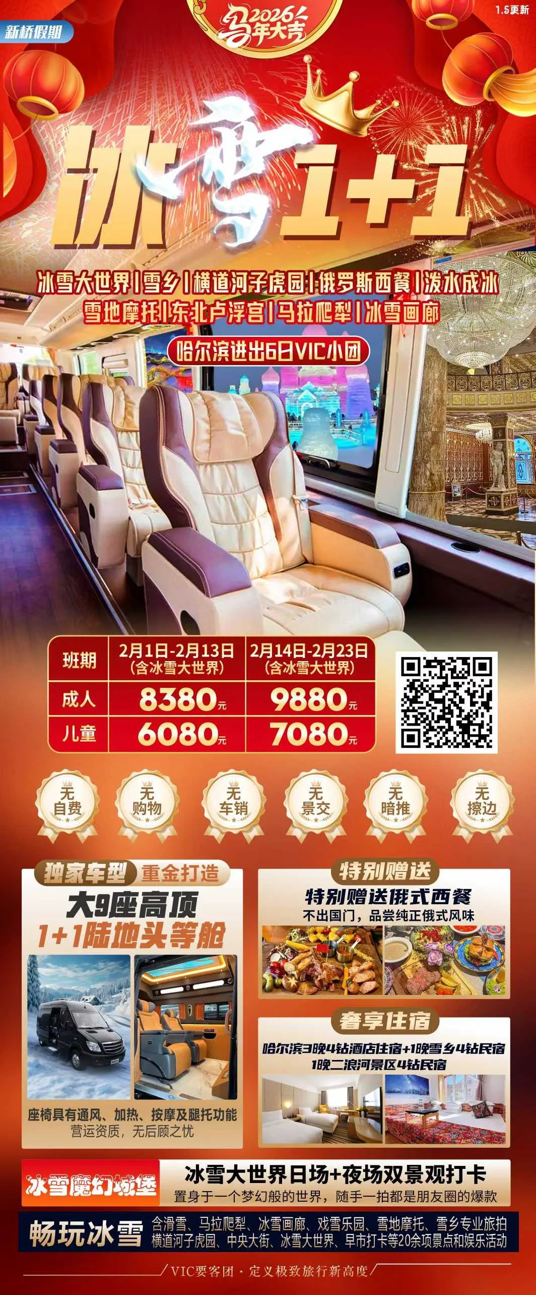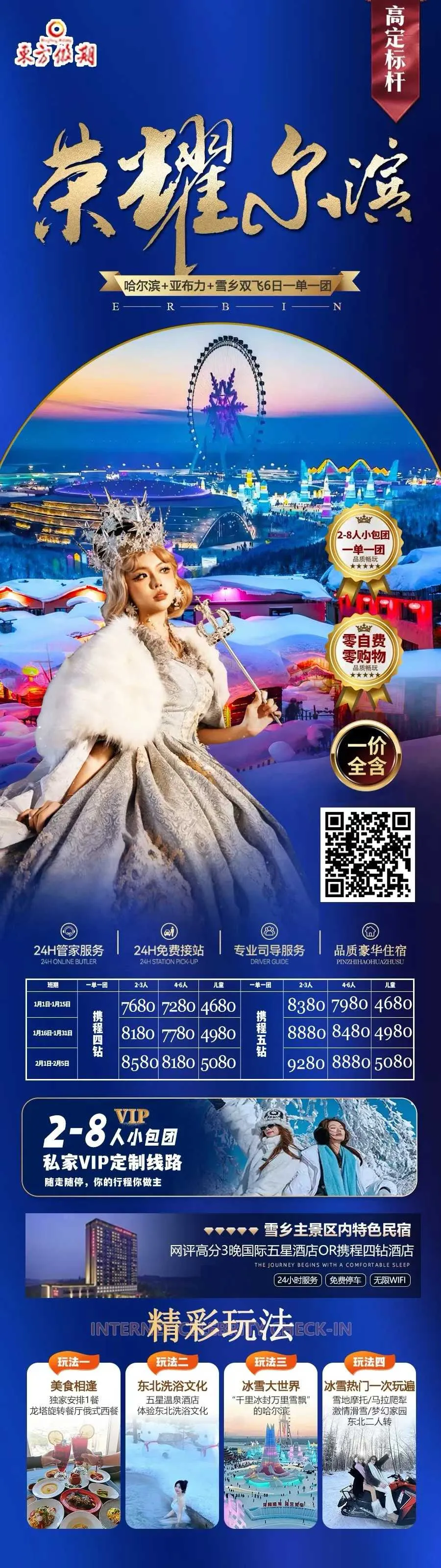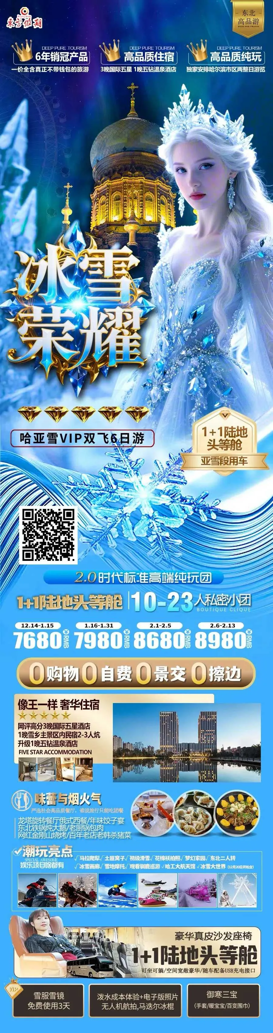 2、冰雪荣耀:高端VIP首选,0自费0购物0景交,独家1+1VIP陆地头等舱用车,三晚入住国际五星+雪乡2-3人炕+五钻温泉酒店。