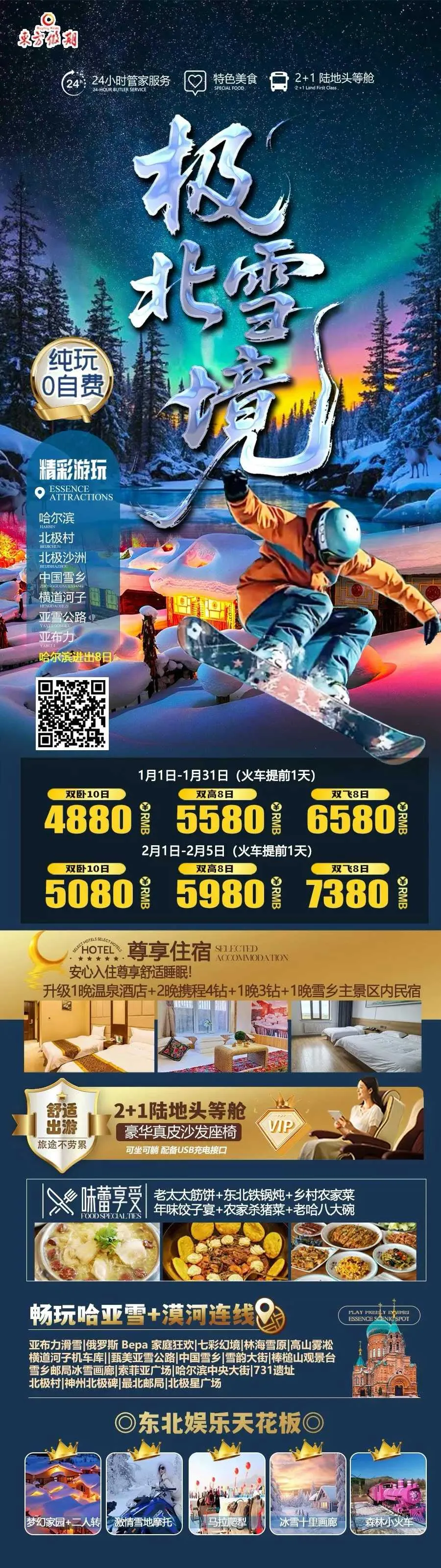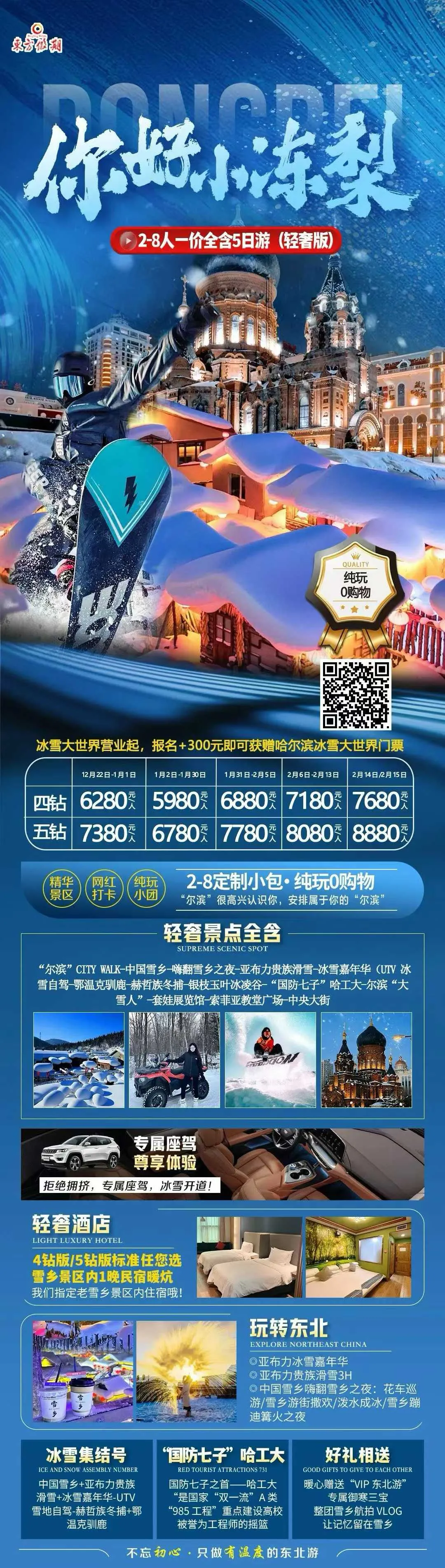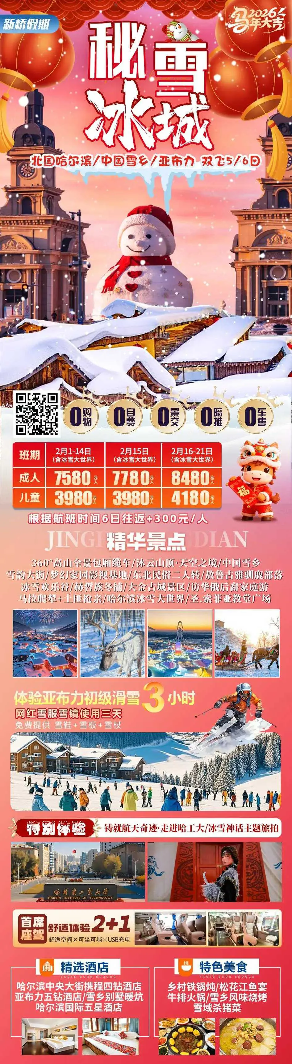 1、冰天雪地:销售冠军,0自费0景交,2+1头等舱,特别含旅拍、航拍,保证住雪乡核心景区、保证住亚布力四钻,哈尔滨四钻+温泉!