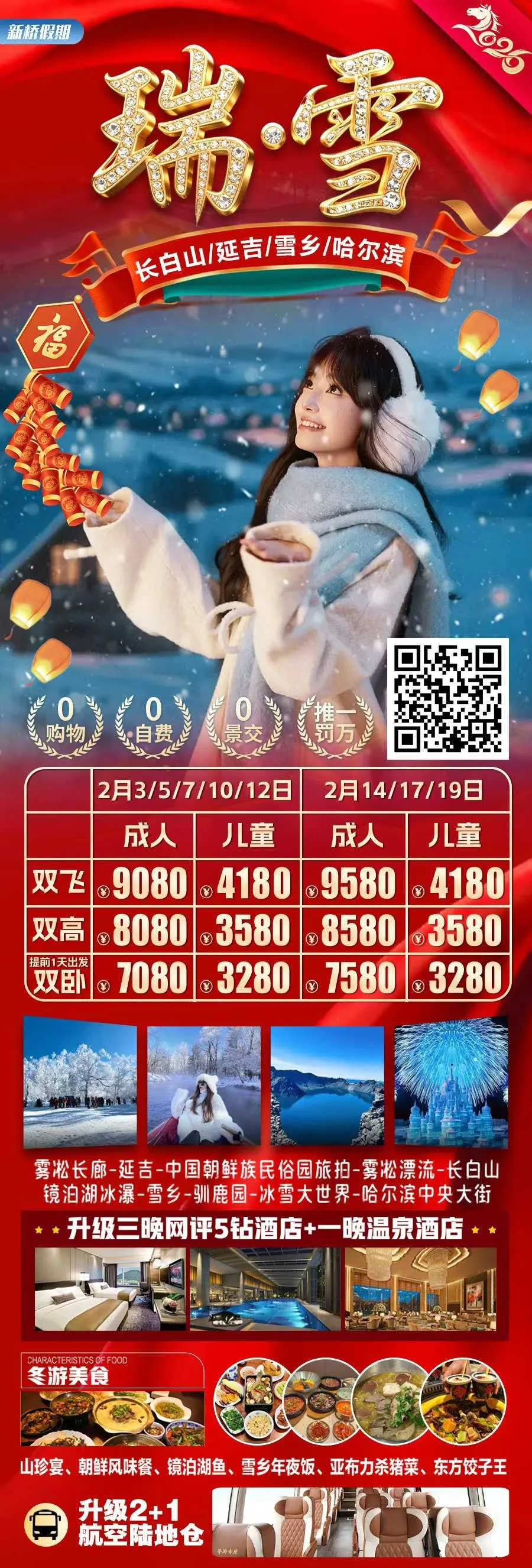 🏨吉林升级一晚五钻酒店+长白山五星温泉酒店+哈尔滨 1晚携程四钻酒店+敦化1晚当地四星+雪乡(2-3人家庭不拆分)