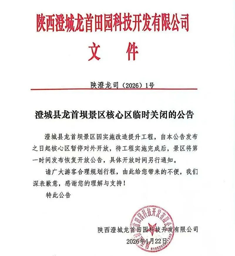 您现在的位置是:首页 > 国内旅游目的推荐 > 正文 国内旅游目的推荐 渭南一地景区临时关闭公告 admin2026年01月27日 02:03:57国内旅游目的推荐1 渭南一地景区临时关闭公告澄城县龙首坝景区核心区临时关闭的公告澄城县龙首坝景区因实施改造提升工程,自本公告发布之日起核心区暂停对外开放,待工程实施完成后,景区将第一时间发布恢复开放公告,具体开放时间另行通知。请广大游客合理规划行程,由此给您带来的不便,我们深表歉意,感谢您的理解与支持!特此公告。陕西澄城龙首田园科技开发有限公司2026年1月22日▍来源:澄城县交道镇人民政府▍合作:0913-8111099▍声明:版权归原作者所有 如有侵权请联系删除戳“阅读原文”发布求职招聘信息!服务热线:0913-8111099 转载请说明来源于"旅荐网",部分内容转载自网络,如有侵权请联系qlwl@foxmail.com删除 本文地址:https://www.15386.cn/post/87050.html 上一篇 福建省泉州地区石狮市十大旅游景点 下一篇 说出你心中最美的欧洲景点! 相关文章 住4A景区,叹自助早餐+晚餐!泡高山温泉+无边泳池+亲子乐园!6人套票799元 【抖音团购】宜州会仙山景区 今天开抢!新化景区全免票+1亿消费券,“热气腾腾新化年”等你来! 中国3个含金量超高的AAAAA景区,去过1个就值了! 华山之后,陕西又一5A景区宣布免费!国家地理称此生必去 中国含金量超高的二十个AAAAA景区,看看你去过多少? 广西柳州六大必去景点,2026春节旅游最合适的地方 免费半价!本周末陕西一大波景区门票优惠!挑一个去浪 江苏无锡六大必去景点,2026春节旅游最合适的地方 山东枣庄六大必去景点,2026春节旅游最合适的地方 发表评论 取消回复 评论列表 这篇文章还没有收到评论,赶紧来抢沙发吧~