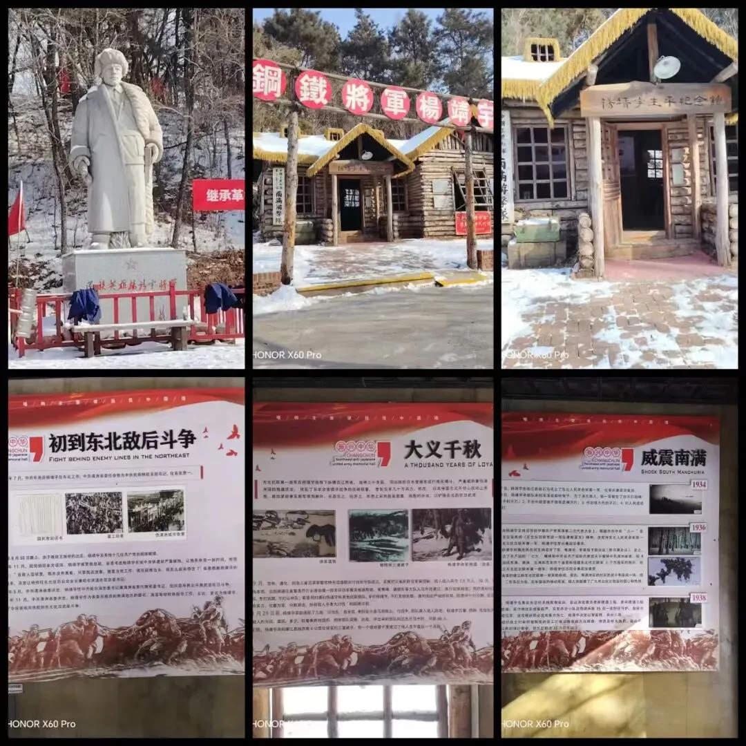 左边小山上,东北抗联文化展示馆和钢铁将军杨靖宇生平纪念馆则是将抗联和杨靖宇将军的战斗经历充分展示,让我们体会到在当时艰苦环境下,抗联在抗战中表现出来的巨大意志和伟大精神。杨靖宇将军塑像静静的站立,欣慰地看到祖国繁荣、民族复兴。我们忍不住向从儿时就无比敬仰的抗日英雄鞠躬敬礼。