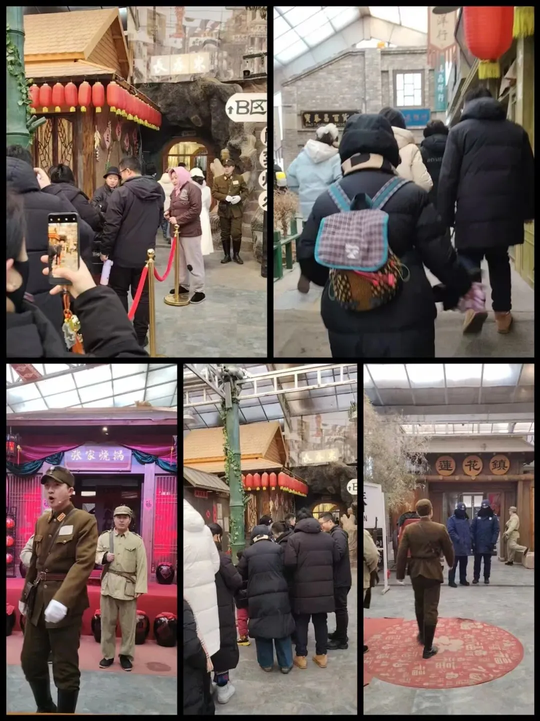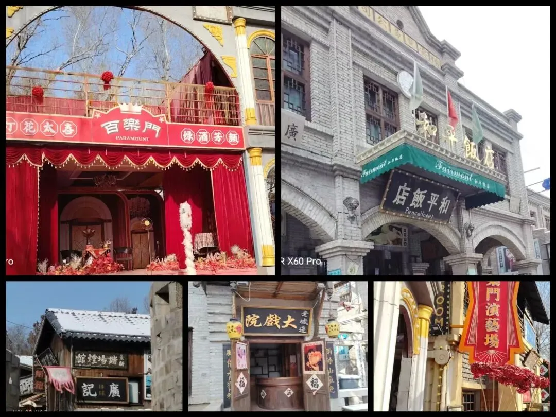 走到洪熙街,已经是正午了。洪熙街绝对是影视基地的核心,一眼就可以看出是民国时期的现代化大都市,里面有和平饭店、百乐门等高档场所。据说也是许多以抗战为背景的沉浸式情景剧的演出地,由游客当演员,进行接头、对暗号、躲避特务的地下党活动,还有东北秧歌、舞龙舞狮、民国市集等配套活动,再现在纸醉金迷的城市生活中,有一批冒着随时被抓、被杀风险的地下工作者的英勇故事。可惜的是,我们去的时候演出已经结束,只能拍摄了许多照片。刚好“百乐门”正在播放歌曲,我忍不住上去“演唱”了一曲。