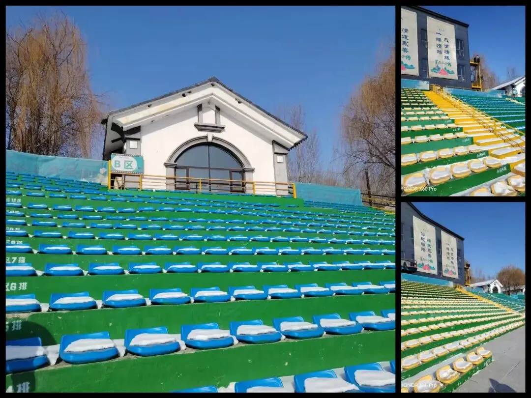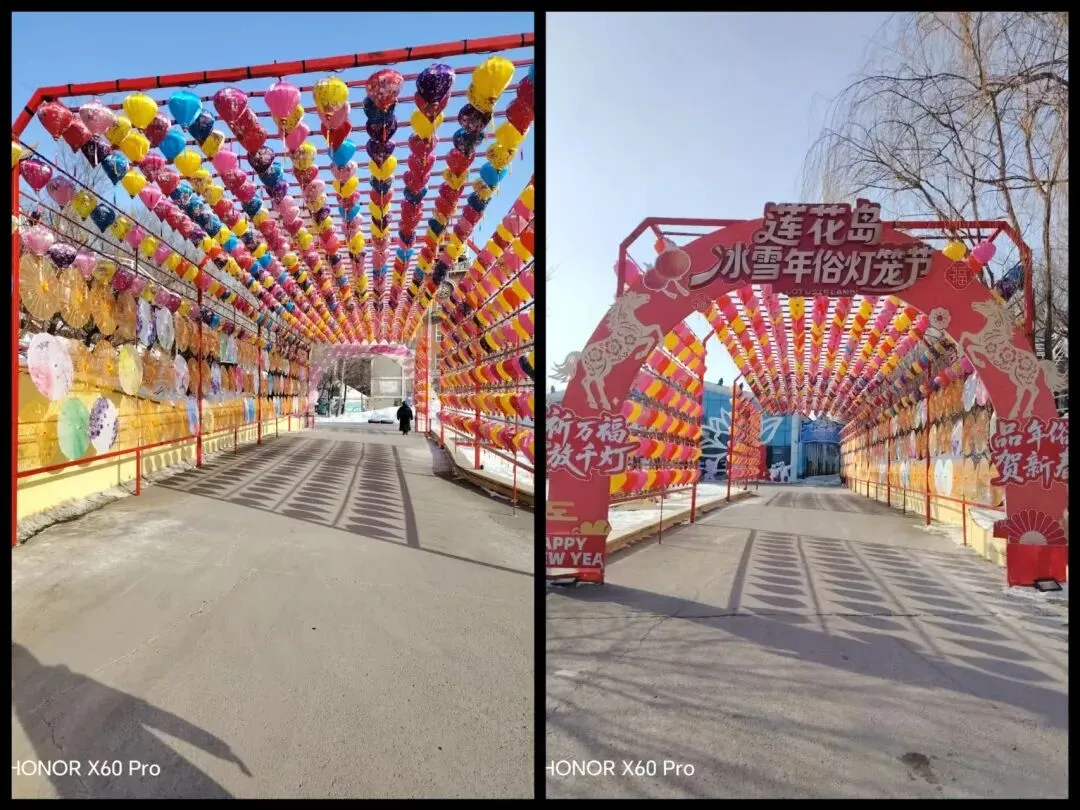 钟楼边上,是写着“莲花岛冰雪年俗灯笼节”字样的五彩长廊,是由各种色彩斑斓的灯笼和纸扇搭成,我称之为“彩色光影时空长廊”,一定会受到南方小土豆们的喜爱。