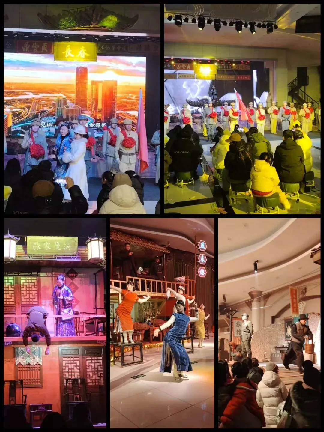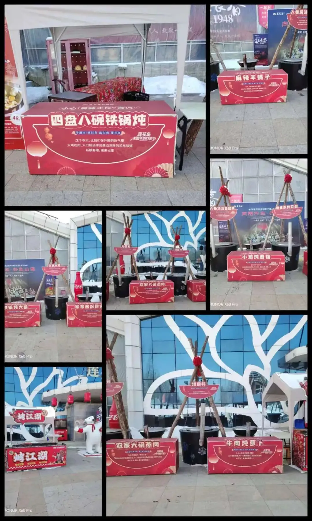 走过五彩长廊,就是今天要看的情景剧《这是长春•1948》的演出地——莲花剧场。莲花剧场的B区门没开,向前走,一排摆放着“四盘八碗铁锅炖”的台子。我想,这应该诸如我老家传统举办宴席必上的“八大碗”吧,区别是品种不一样而已。如果是跟随旅游团来,体验一下东北的“四盘八碗铁锅炖”的宴席未免更妙,说不定剧场里面还提供婚庆喜宴的互动表演呢,那东北农村宴席的体验感绝对满屏。