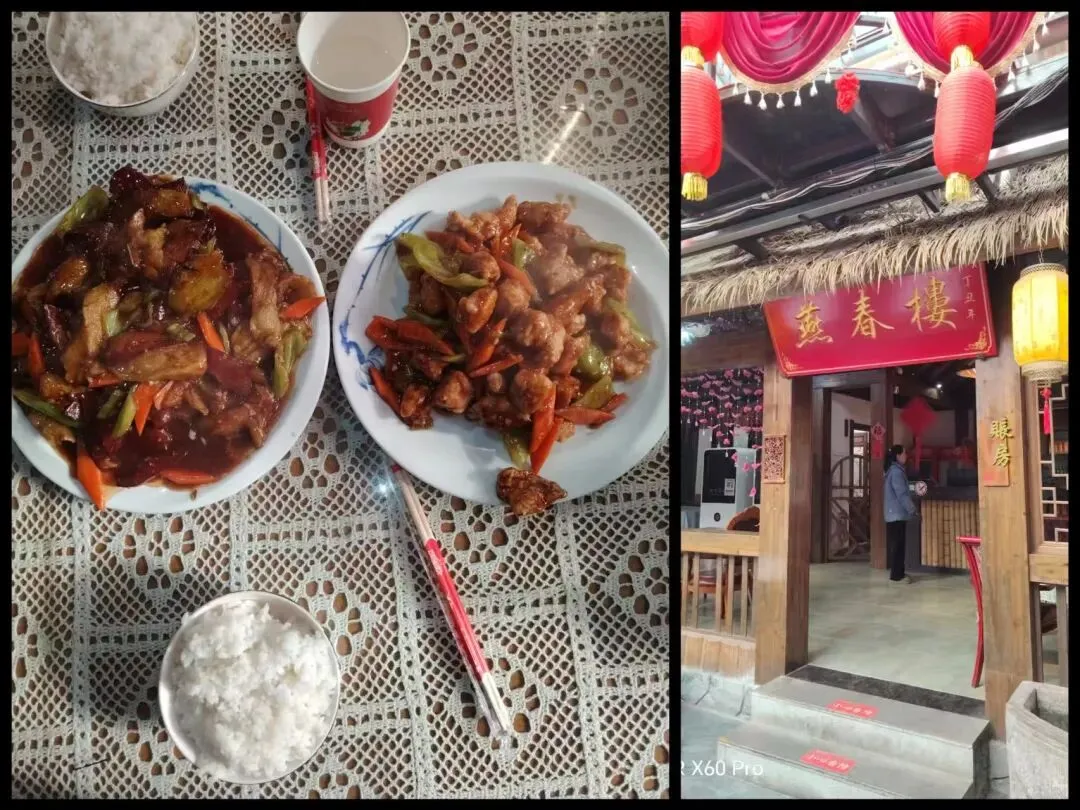 到吃饭时间了,先生说饿了,但我们并不想吃小吃,就继续向前走,来到一个大厅,走进燕春楼,点了两个菜。菜量很大,有东北饭店的特点,我们吃剩了一半。