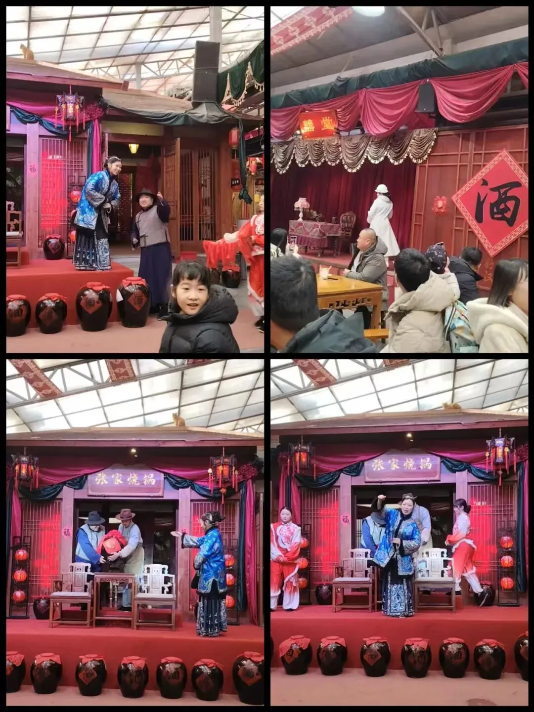下午2:00,工作人员引导我们在大厅的桌子上就坐。一个“财主”走出,做了开场白。财主张家举办喜宴,宴请乡情,我们都成了宴会的宾客。原来《这是长春•1948》的演出已经开始了,我们这些游客都成为故事中的人了。故事开始引入张母和张家兄妹四人,交代所处的动荡、困苦的年代,然后宣布我们这些群众演员全部跟随主演转移。