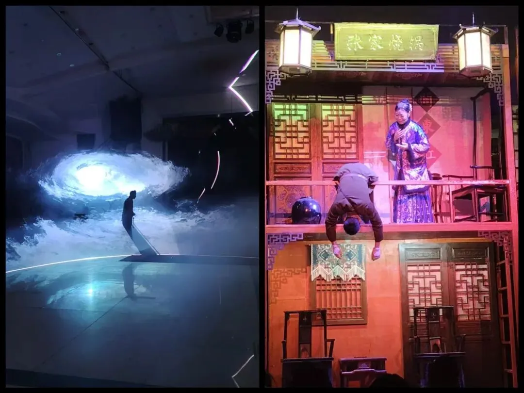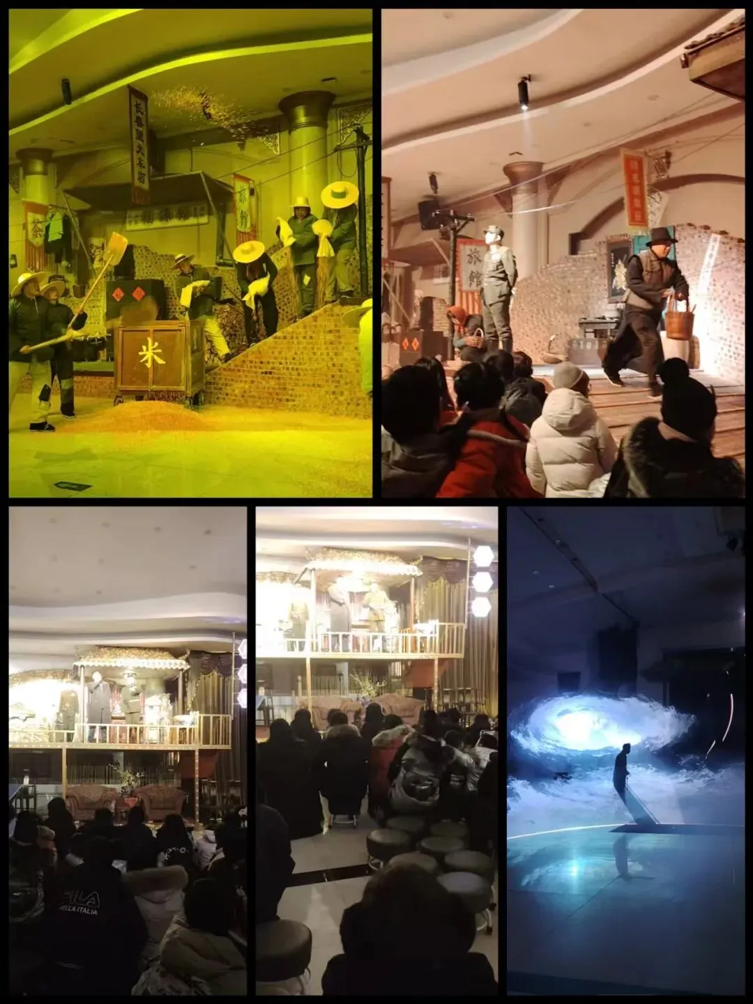 走进灯光关闭的演出B区,演出正式开始了。场景布置在四周,游客坐在中间,场景在四周不断切换,我们坐着滑轮小凳随着滑动,情绪也在场景的转换和小凳的滑动中不断变化。