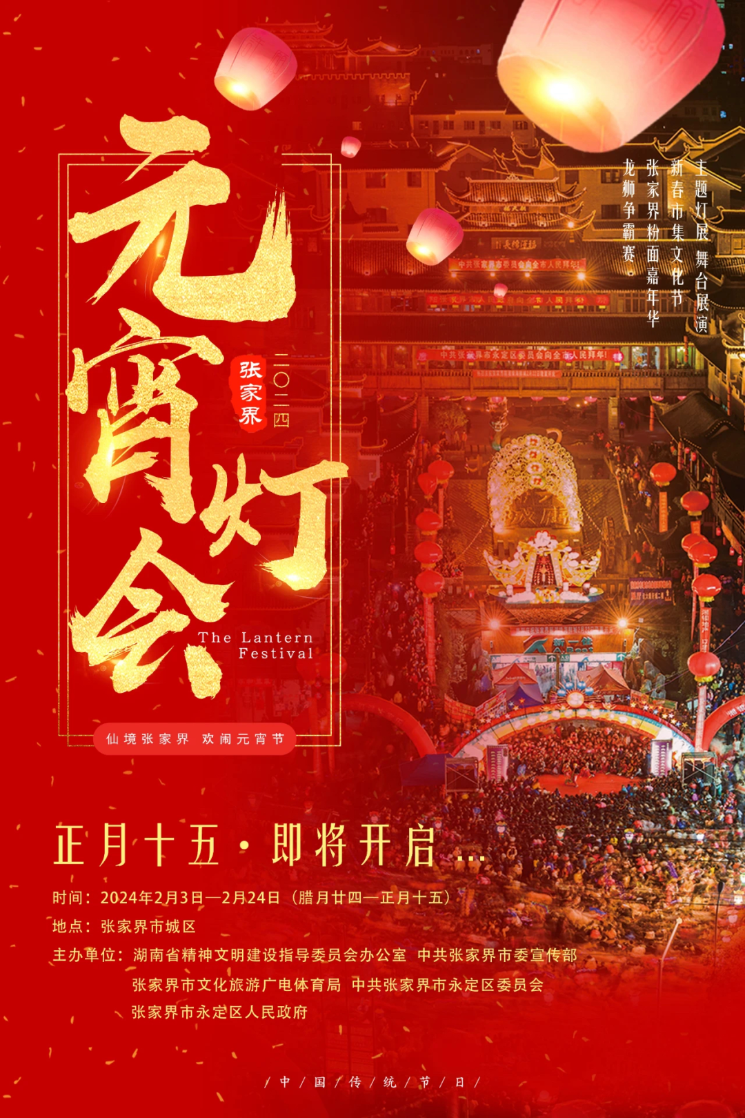 张家界元宵灯会,精彩的非遗盛宴,历史悠久,深受群众喜爱,已成为陪伴人们多年的集体记忆,是一道不可或缺的年俗大餐。每届灯会,不仅是春节期间张家界人热议的焦点,还吸引众多宾朋不远千里来感受“国际张”魅力。阔别四年,2024张家界元宵灯会以“元宵奇妙会·国潮嘉年华”为主题,焕新回归。2024张家界元宵灯会作为2024张家界冬季文化旅游系列活动的重要内容,已纳入2024年湖南省“我们的节日·元宵”主题活动,将于2月3日至2月24日(农历腊月廿四至正月十五)在张家界市城区举行。