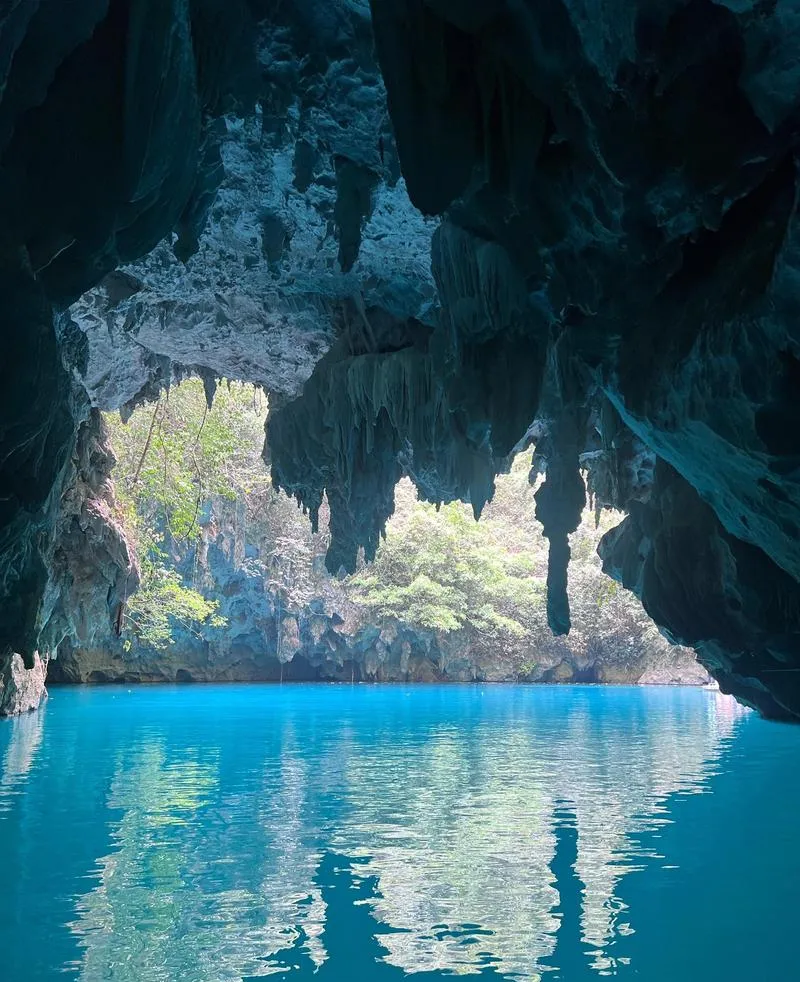 天窗漏下来的光打在水面上,形成一圈一圈的光晕,这种光影效果在夏天看不清楚,因为夏天光太强,反而把这种细微的层次冲淡了,冬天的光是斜的、柔的,打在洞壁上、水面上,会出现一种很微妙的渐变,从亮到暗,从蓝到绿,这种渐变不是设计出来的,是自然形成的,但比任何人工灯光都好看。