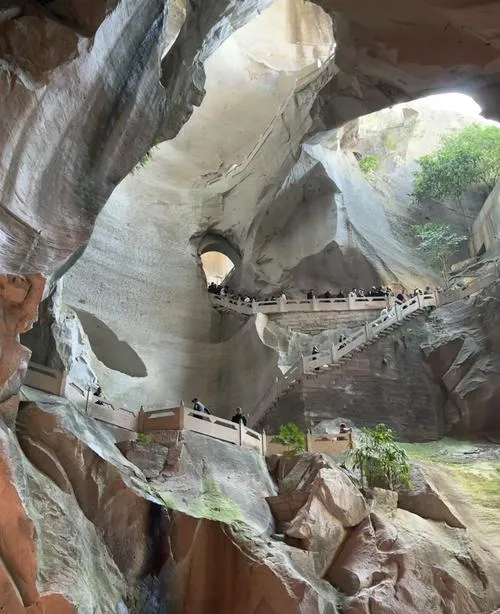 这个景区的核心卖点就是人工开凿的洞穴群,听起来好像没什么,但你带孩子走进去就会发现,这些洞穴里藏着的东西远比你想象的多。首先是那种"走进山体内部"的新鲜感,孩子平时看山都是从外面看,突然有一天你告诉他咱们今天要走进山里面去,那种好奇心立刻就被调动起来了,进去之后发现里面别有洞天,有石壁、有水潭、有光影变化,完全是另一个世界。