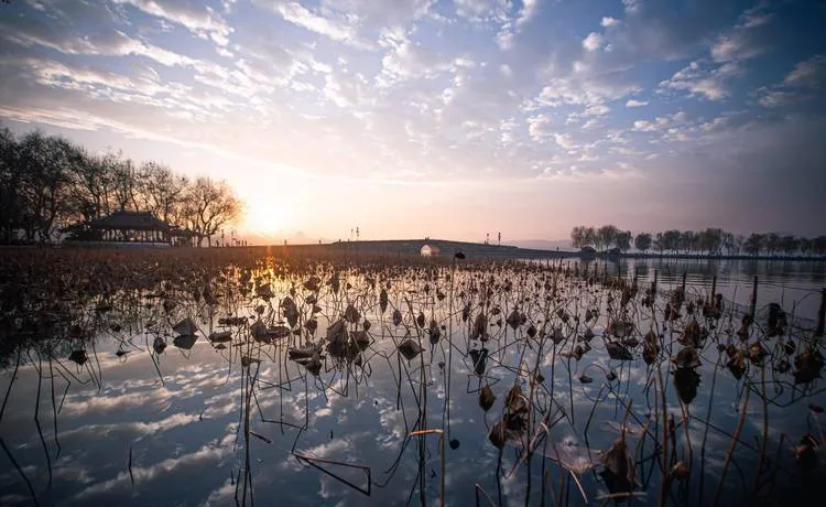 湖面在冬天会结一层薄冰,阳光打上去是那种泛白的光,四周的树都光秃秃的,但恰恰是这种光秃,让整个湖的轮廓特别清楚,你能看到湖心岛、九曲桥、远处的山,所有东西都摆在那,没有枝叶遮挡,没有游客喧闹,就是你和这片湖。这种景色拍照特别出片,那种冷色调的孤寂感,是春夏完全拍不出来的。