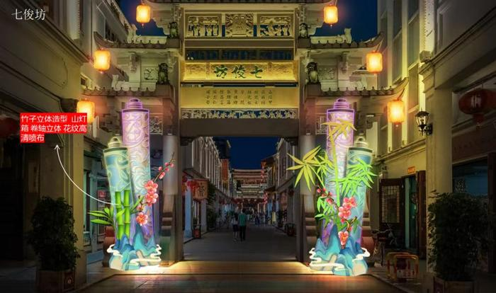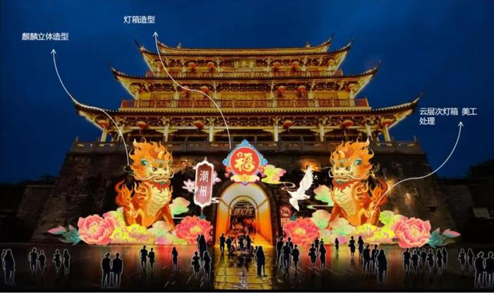 2月7日至3月8日,在下水门、广济门、竹木门、上水门四大城门打造龙年灯组,融入潮州民间大锣鼓、麒麟、龙凤等元素,让四大城门绚丽多彩;选取理学儒宗坊等10个牌坊,围绕牌坊的代表人物及其背后的故事主题设计灯组布展,并配套少量灯笼元素,营造良好的节日氛围。
