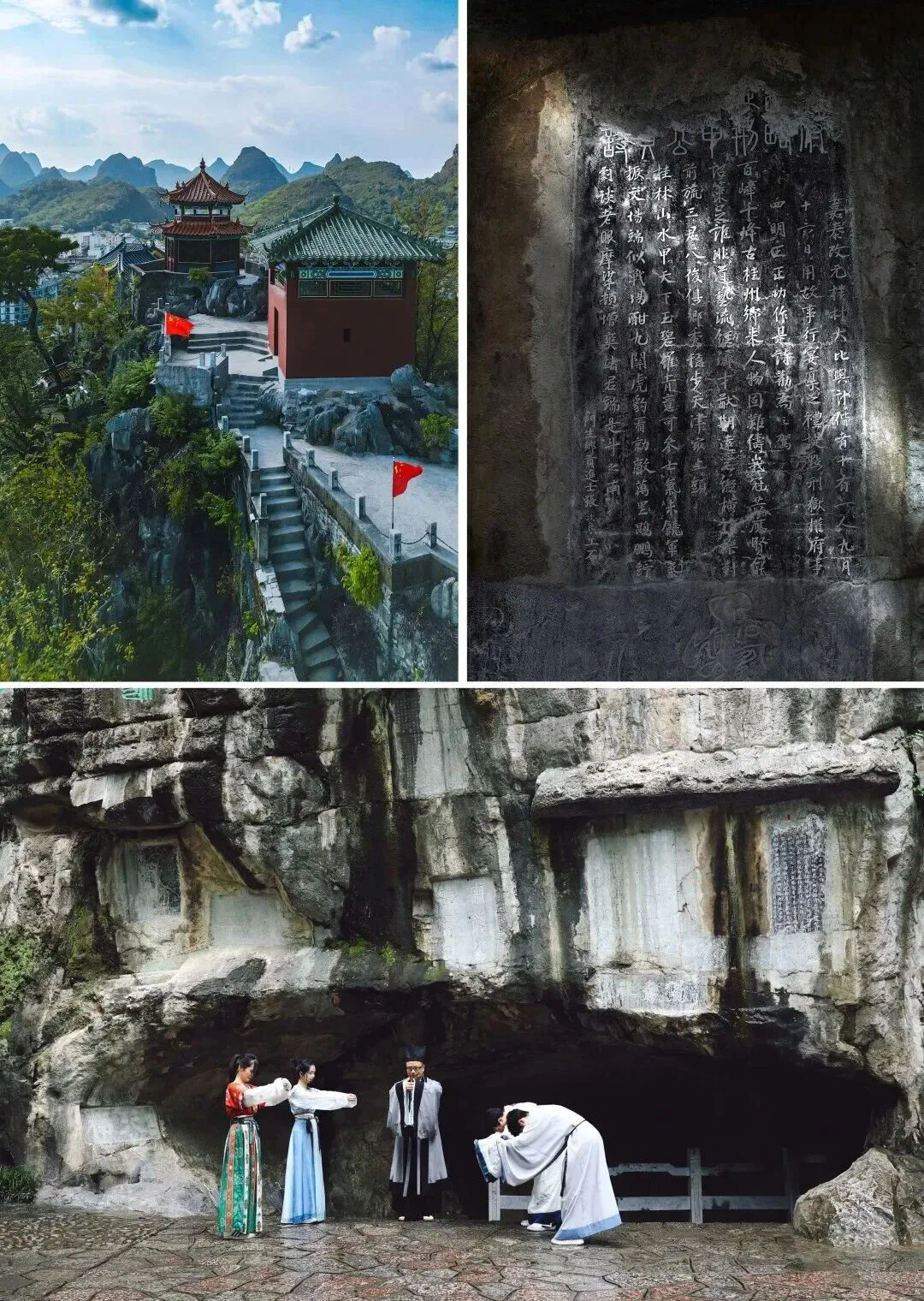 独秀峰旁的中山纪念碑铭刻着一段真正的历史:1921 年,孙中山督师北伐时曾在王府设立大本营。上下独秀峰约需 30 分钟,山顶可以远眺桂林市区和山水风光,位置最佳的东观光台,这座已有 3.5 亿年历史的石灰岩山体,周围遍布历代题刻136件,最有名的两处位于其东麓的读书岩:南朝颜延之的 “未若独秀者,峨峨郛邑间” 开时代之先河,后世赞美桂林之诗歌皆滥觞于此;宋代王正功的 “桂林山水甲天下” 成为桂林最著名的广告词。